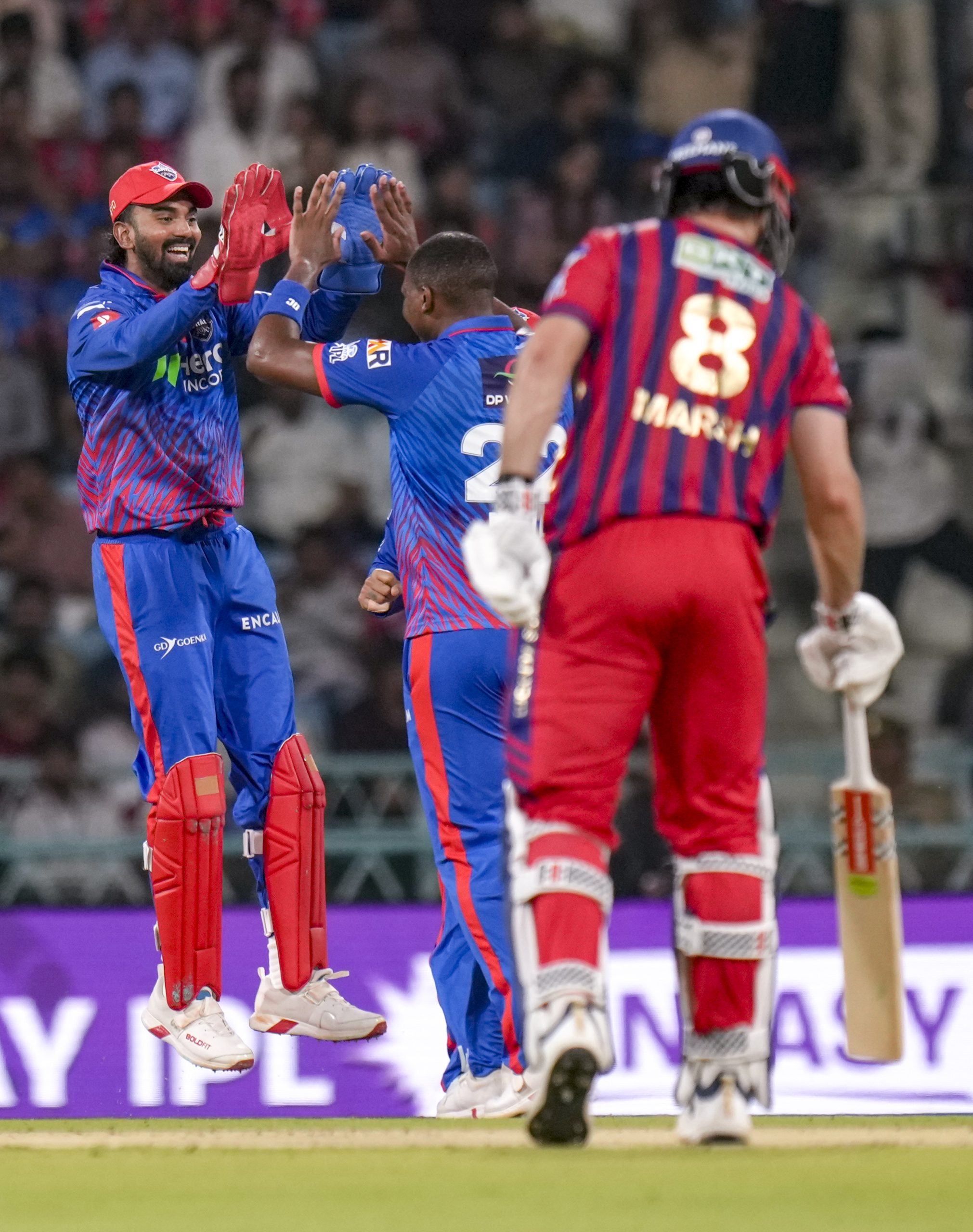 Lucknow: Delhi Capitals’ KL Rahul, left, and Lungi Ngidi, centre, celebrates after the wicket of Lucknow Super Giants’ Nicholas Pooran during the Indian Premier League (IPL) 2026 cricket match between Lucknow Super Giants and Delhi Capitals, at Ekana Stadium in Lucknow, Wednesday, April 1, 2026. (PTI Photo/Shahbaz Khan)(PTI04_01_2026_000464B)