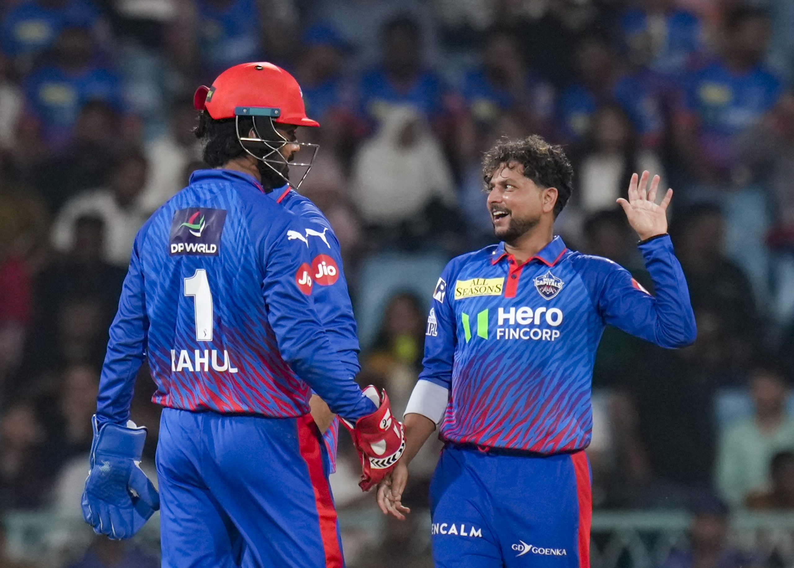 Lucknow: Delhi Capitals’ Kuldeep Yadav, right, with KL Rahul celebrates after the wicket of Lucknow Super Giants’ Mitchell Marsh during the Indian Premier League (IPL) 2026 cricket match between Lucknow Super Giants and Delhi Capitals, at Ekana Stadium in Lucknow, Wednesday, April 1, 2026. (PTI Photo/Shahbaz Khan)(PTI04_01_2026_000478B)