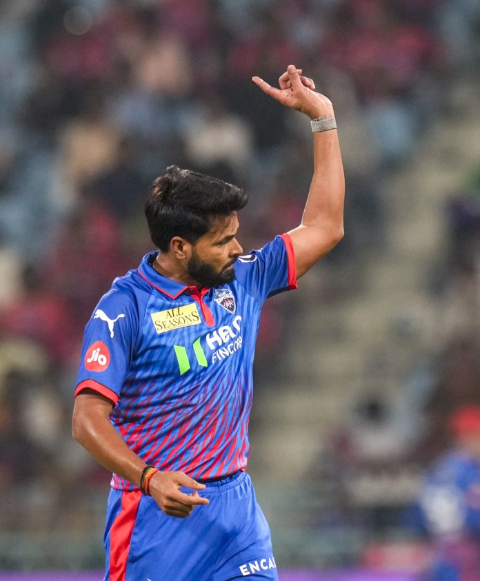 Lucknow: Delhi Capitals’ Mukesh Kumar celebrates after the wicket of Lucknow Super Giants’ captain Rishabh Pant during the Indian Premier League (IPL) 2026 cricket match between Lucknow Super Giants and Delhi Capitals, at Ekana Stadium in Lucknow, Wednesday, April 1, 2026. (PTI Photo/Shahbaz Khan)(PTI04_01_2026_000423B)