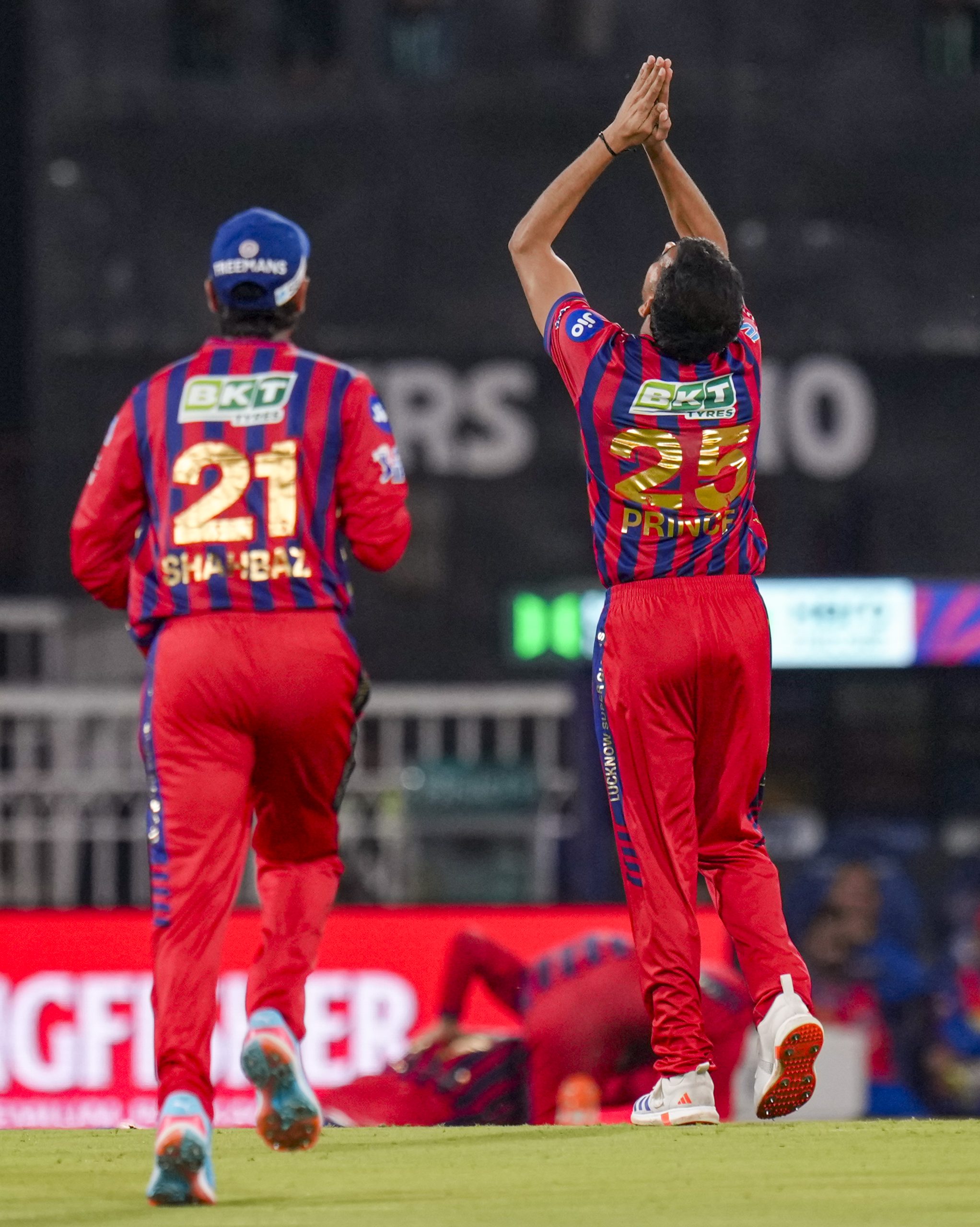 Lucknow: Lucknow Super Giants' Prince Yadav, right, reacts after the wicket of Delhi Capitals' Pathum Nissanka during the Indian Premier League (IPL) 2026 cricket match between Lucknow Super Giants and Delhi Capitals, at Ekana Stadium in Lucknow, Wednesday, April 1, 2026. (PTI Photo/Shahbaz Khan)(PTI04_01_2026_000557B)