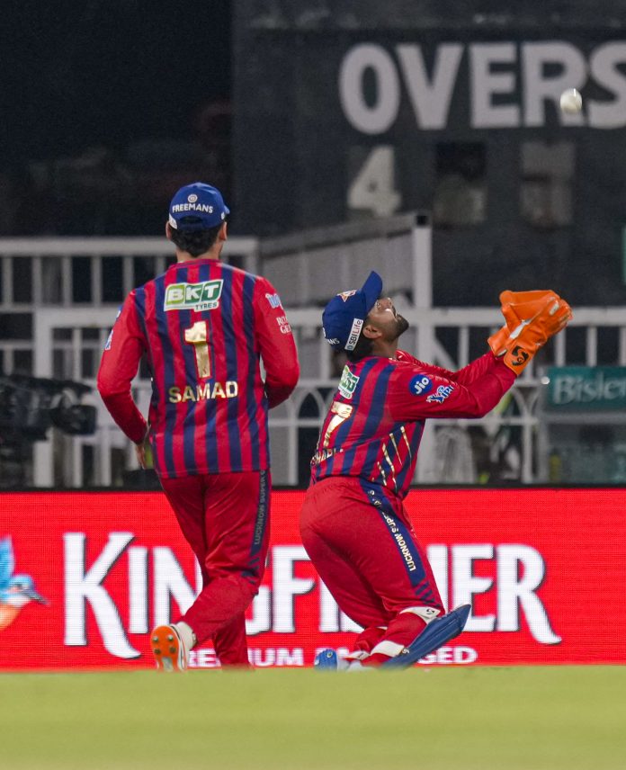 Lucknow: Lucknow Super Giants’ captain Rishabh Pant, right, takes a catch of Delhi Capitals’ Pathum Nissanka during the Indian Premier League (IPL) 2026 cricket match between Lucknow Super Giants and Delhi Capitals, at Ekana Stadium in Lucknow, Wednesday, April 1, 2026. (PTI Photo/Shahbaz Khan)(PTI04_01_2026_000558B)