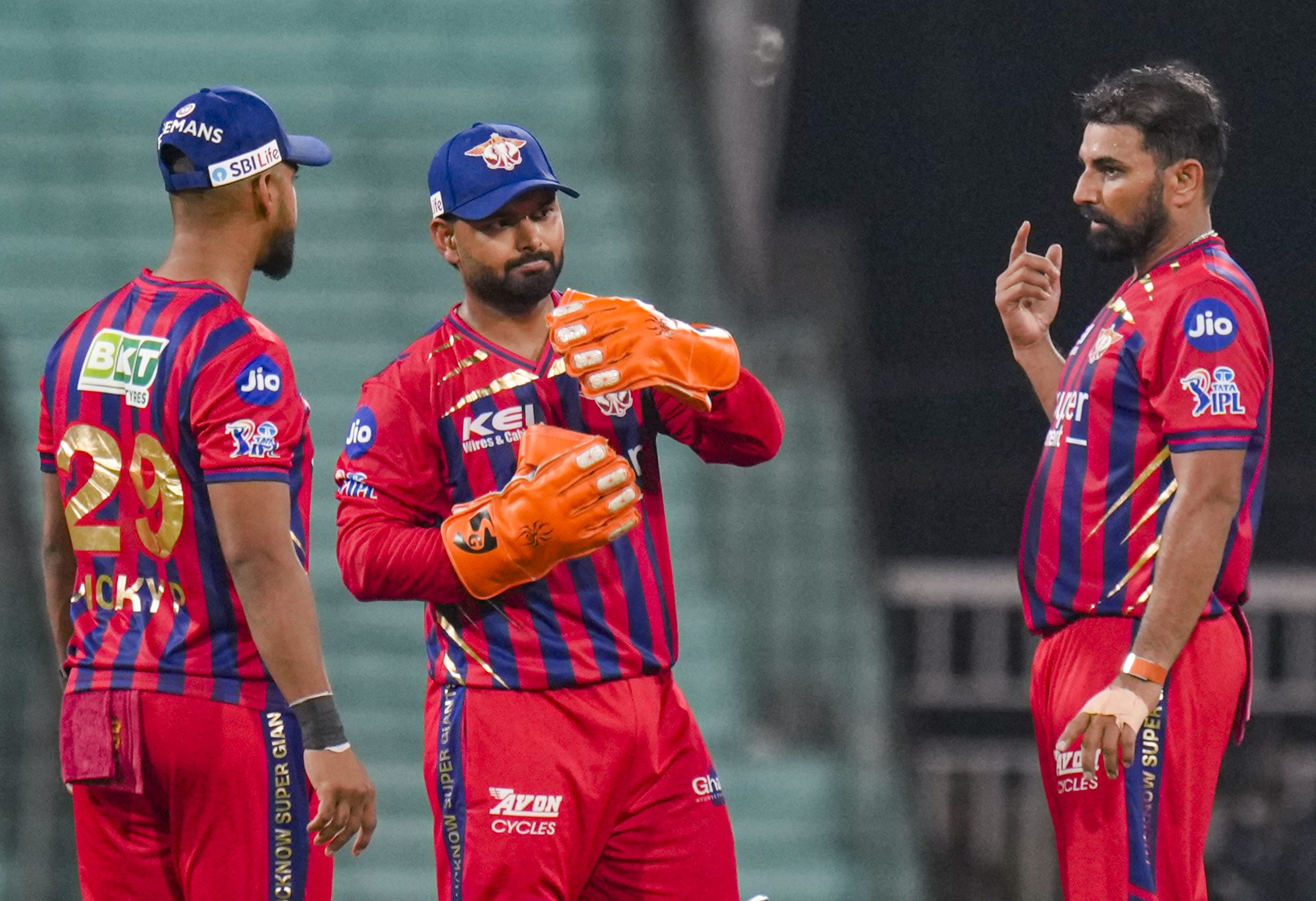 Lucknow: Lucknow Super Giants’ captain Rishabh Pant, centre, with Mohammed Shami, right, during the Indian Premier League (IPL) 2026 cricket match between Lucknow Super Giants and Delhi Capitals, at Ekana Stadium in Lucknow, Wednesday, April 1, 2026. (PTI Photo/Shahbaz Khan)(PTI04_01_2026_000580B)