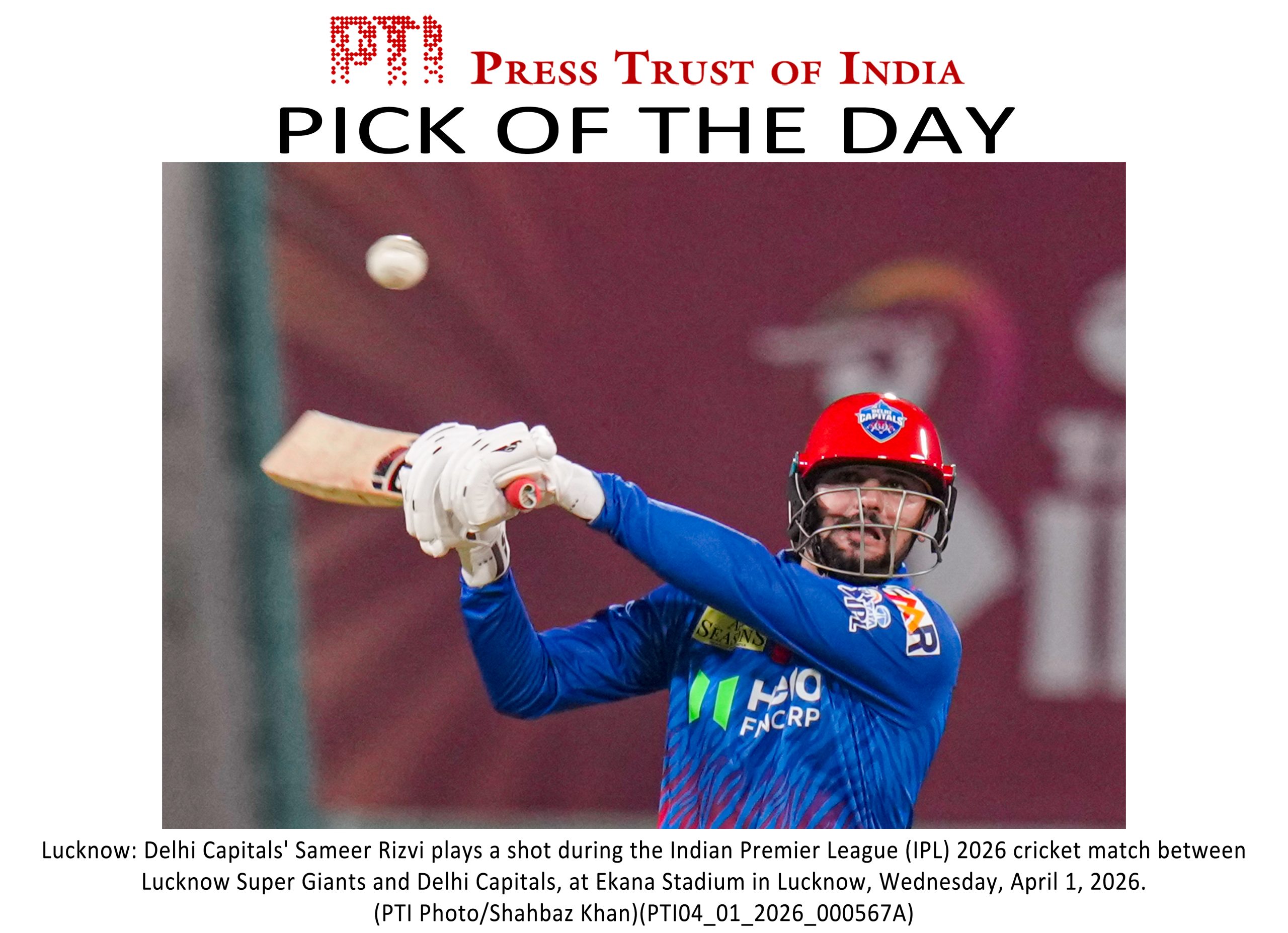 PLS TAKE NOTE OF THIS PTI PICK OF THE DAY::: Lucknow: Delhi Capitals' Sameer Rizvi plays a shot during the Indian Premier League (IPL) 2026 cricket match between Lucknow Super Giants and Delhi Capitals, at Ekana Stadium in Lucknow, Wednesday, April 1, 2026. (PTI Photo/Shahbaz Khan)(PTI04_01_2026_000567A)(PTI04_01_2026_000589B)
