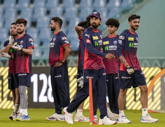 Lucknow: From left, Delhi Capitals’ Vipraj Nigam, Sameer Rizvi, Auqib Nabi, KL Rahul, Sahil Parakh and captain Axar Patel during a practice session ahead of an Indian Premier League (IPL) 2026 T20 cricket match between Lucknow Super Giants and Delhi Capitals, in Lucknow, Uttar Pradesh, Tuesday, March 31, 2026. (PTI Photo/Shahbaz Khan) (PTI03_31_2026_000378B) *** Local Caption ***