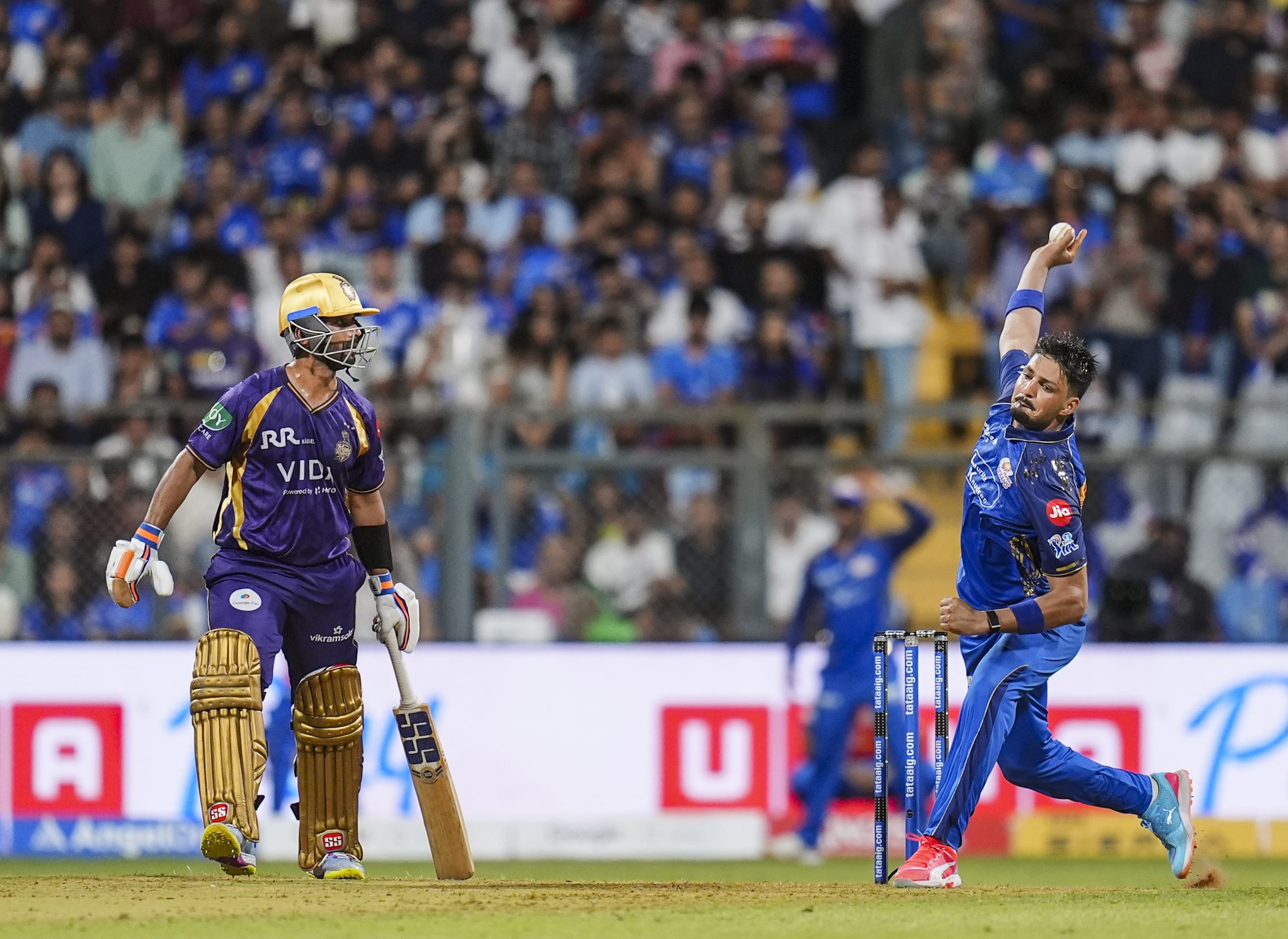 Mumbai: Mumbai Indians’ Allah Ghazanfar bowls a delivery during an Indian Premier League (IPL) 2026 T20 cricket match between Mumbai Indians and Kolkata Knight Riders, at the Wankhede Stadium, in Mumbai, Maharashtra, Sunday, March 29, 2026. (PTI Photo/Kunal Patil) (PTI03_29_2026_000341B)