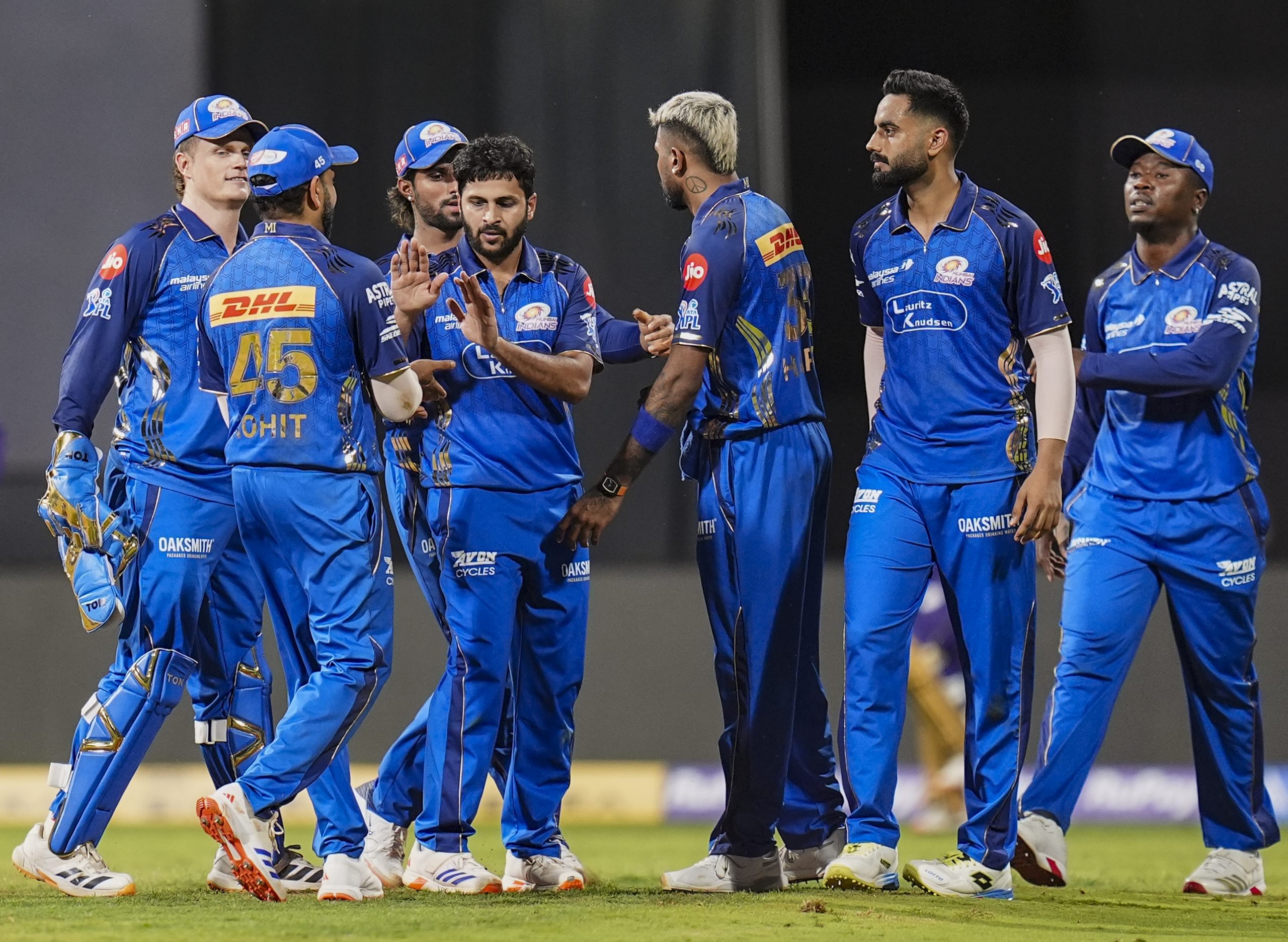 Mumbai: Mumbai Indians’ Shardul Thakur celebrates with teammates after taking the wicket of Kolkata Knight Riders’ captain Ajinkya Rahane during an Indian Premier League (IPL) 2026 T20 cricket match between Mumbai Indians and Kolkata Knight Riders, at the Wankhede Stadium, in Mumbai, Maharashtra, Sunday, March 29, 2026. (PTI Photo/Kunal Patil) (PTI03_29_2026_000376B)