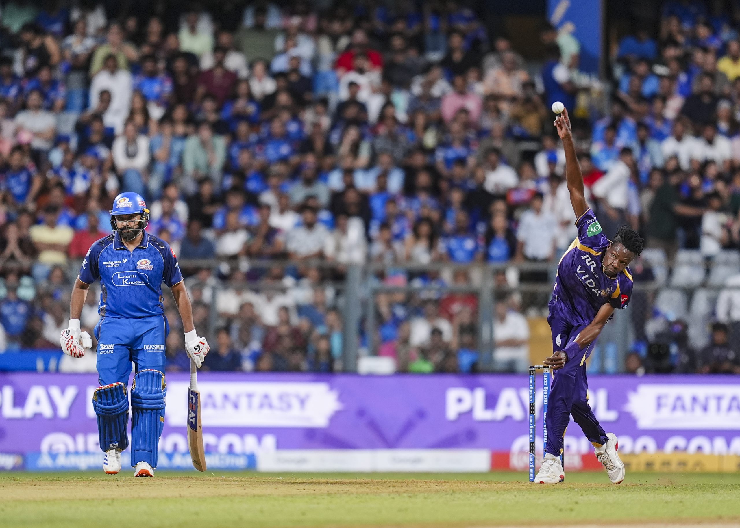 Mumbai: Kolkata Knight Riders’ Blessing Muzarabani bowls a delivery during an Indian Premier League (IPL) 2026 T20 cricket match between Mumbai Indians and Kolkata Knight Riders, at the Wankhede Stadium, in Mumbai, Maharashtra, Sunday, March 29, 2026. (PTI Photo/Kunal Patil) (PTI03_29_2026_000409B)