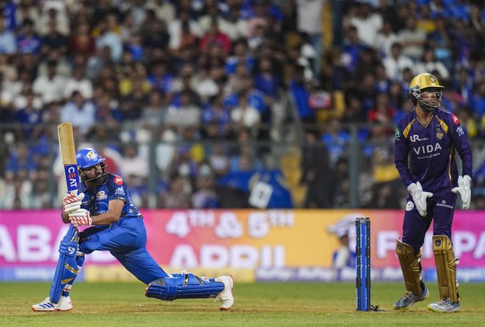 Mumbai: Mumbai Indians’ Rohit Sharma plays a shot during an Indian Premier League (IPL) 2026 T20 cricket match between Mumbai Indians and Kolkata Knight Riders, at the Wankhede Stadium, in Mumbai, Maharashtra, Sunday, March 29, 2026. (PTI Photo/Kunal Patil) (PTI03_29_2026_000441B)