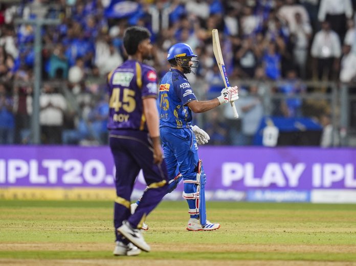 Mumbai: Mumbai Indians’ Rohit Sharma celebrates his half century during an Indian Premier League (IPL) 2026 T20 cricket match between Mumbai Indians and Kolkata Knight Riders, at the Wankhede Stadium, in Mumbai, Maharashtra, Sunday, March 29, 2026. (PTI Photo/Kunal Patil) (PTI03_29_2026_000427B)