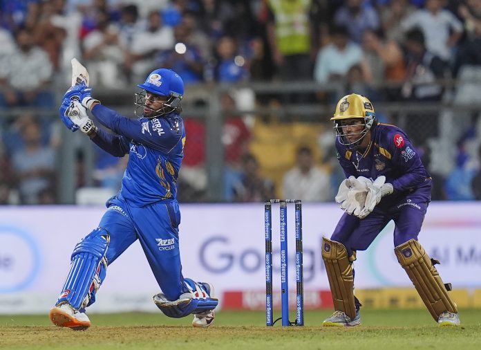 Mumbai: Mumbai Indians’ Tilak Varma plays a shot during an Indian Premier League (IPL) 2026 T20 cricket match between Mumbai Indians and Kolkata Knight Riders, at the Wankhede Stadium, in Mumbai, Maharashtra, Sunday, March 29, 2026. (PTI Photo/Kunal Patil) (PTI03_29_2026_000491B)
