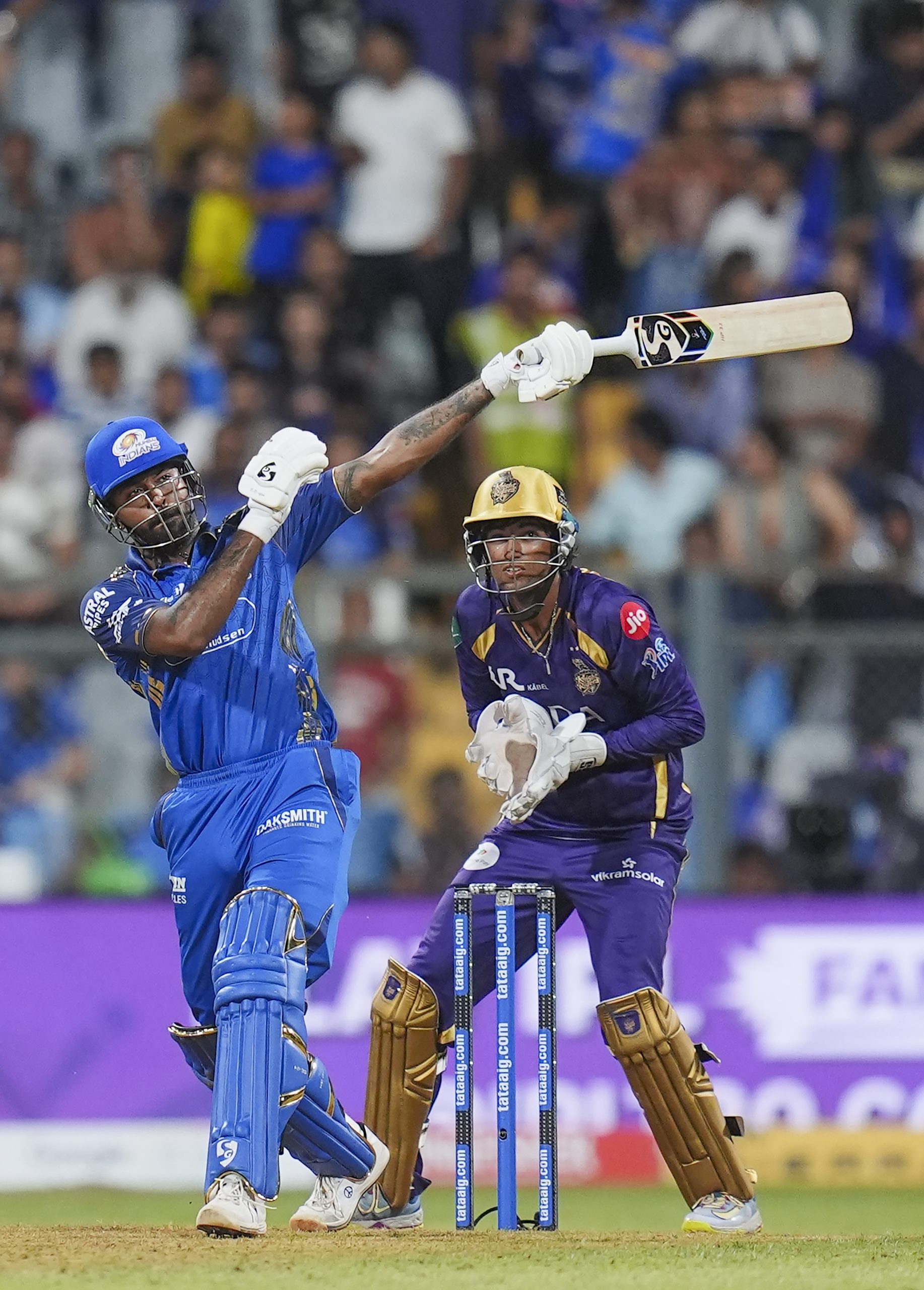 Mumbai: Mumbai Indians’ captain Hardik Pandya plays a shot during an Indian Premier League (IPL) 2026 T20 cricket match between Mumbai Indians and Kolkata Knight Riders, at the Wankhede Stadium, in Mumbai, Maharashtra, Sunday, March 29, 2026. (PTI Photo/Kunal Patil) (PTI03_29_2026_000490B)