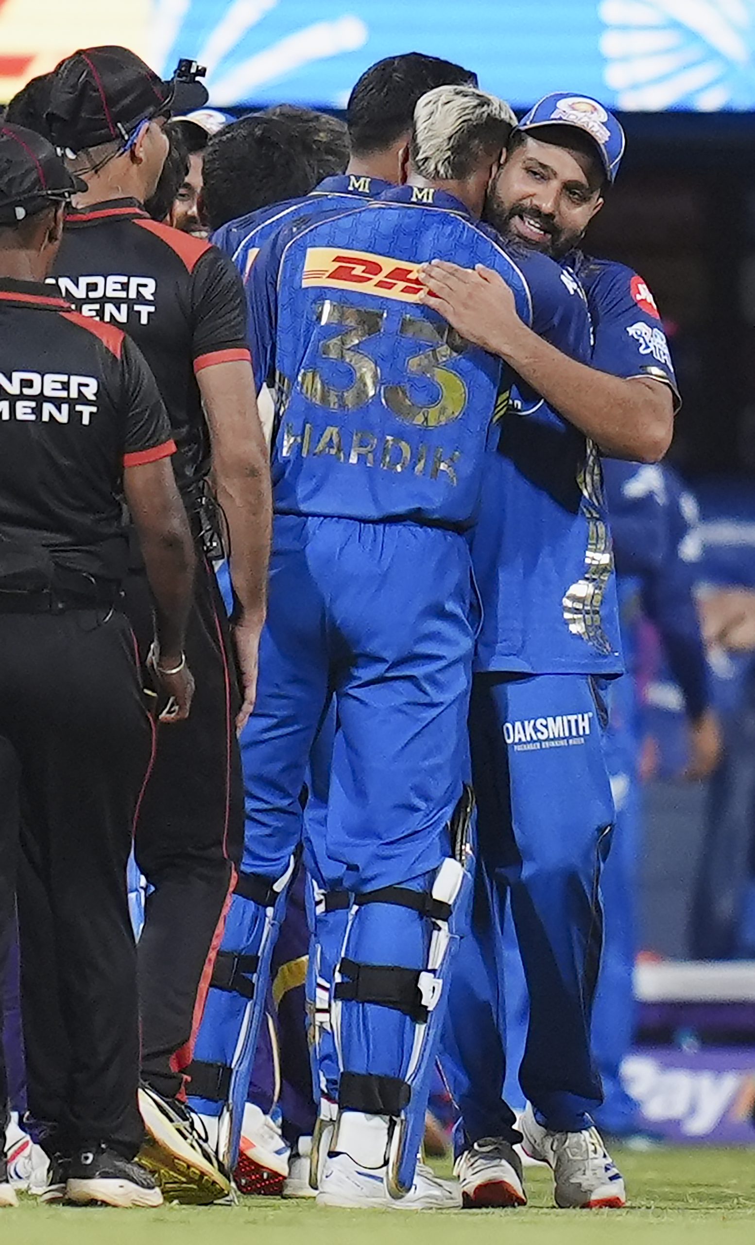 Mumbai: Mumbai Indians’ captain Hardik Pandya being congratulated by Rohit Sharma after winning an Indian Premier League (IPL) 2026 T20 cricket match between Mumbai Indians and Kolkata Knight Riders, at the Wankhede Stadium, in Mumbai, Maharashtra, Sunday, March 29, 2026. (PTI Photo/Kunal Patil) (PTI03_29_2026_000497B)