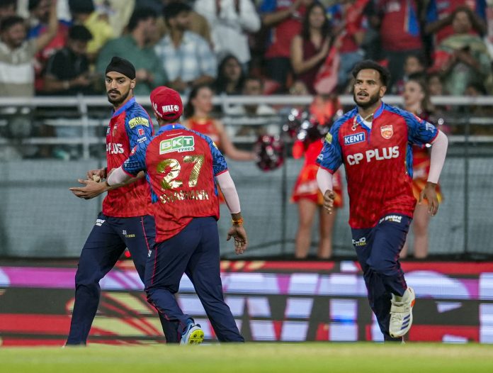 Mullanpur: Punjab Kings’ Vijaykumar Vyshak, right, celebrates with teammates after taking the wicket of Gujarat Titans’ M Shahrukh Khan during an Indian Premier League (IPL) 2026 T20 cricket match between Punjab Kings and Gujarat Titans, in Mullanpur, Tuesday, March 31, 2026. (PTI Photo/Shiva Sharma) (PTI03_31_2026_000413B) *** Local Caption ***