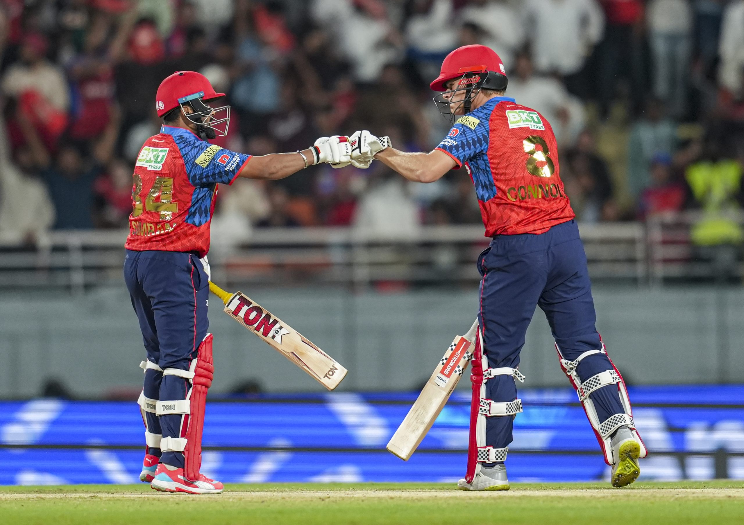 Mullanpur: Punjab Kings’ Prabhsimran Singh, left, and Cooper Connolly greet each other between the wickets during an Indian Premier League (IPL) 2026 T20 cricket match between Punjab Kings and Gujarat Titans, in Mullanpur, Tuesday, March 31, 2026. (PTI Photo/Shiva Sharma) (PTI03_31_2026_000432B) *** Local Caption ***