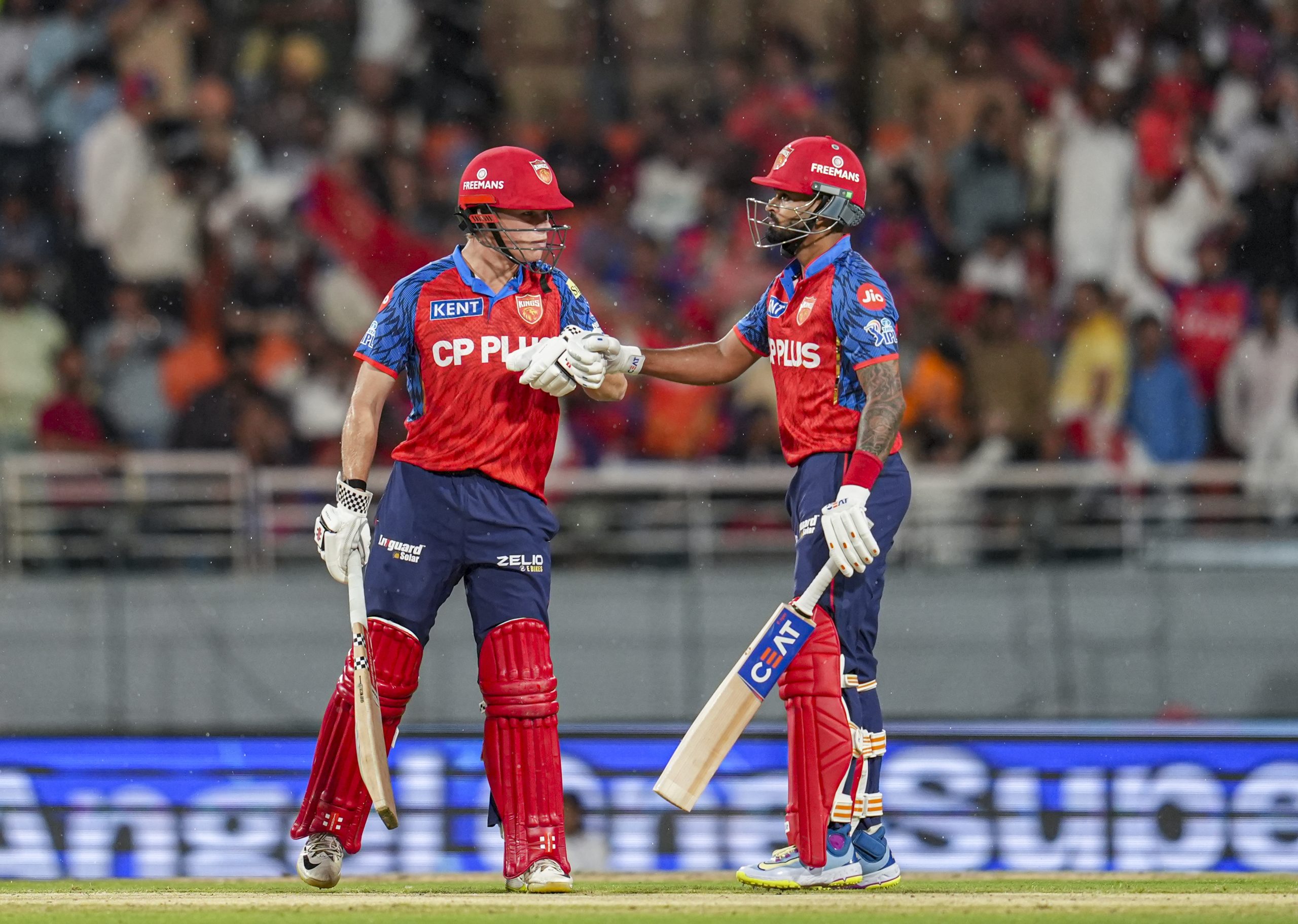 Mullanpur: Punjab Kings’ captain Shreyas Iyer, right, and Cooper Connolly greet each other between the wickets during an Indian Premier League (IPL) 2026 T20 cricket match between Punjab Kings and Gujarat Titans, in Mullanpur, Tuesday, March 31, 2026. (PTI Photo/Shiva Sharma) (PTI03_31_2026_000466B) *** Local Caption ***