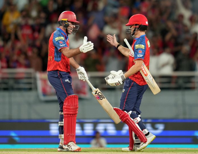 Mullanpur: Punjab Kings’ Cooper Connolly, right, and Xavier Bartlett celebrate after winning an Indian Premier League (IPL) 2026 T20 cricket match between Punjab Kings and Gujarat Titans, in Mullanpur, Tuesday, March 31, 2026. (PTI Photo/Shiva Sharma) (PTI03_31_2026_000518B) *** Local Caption ***