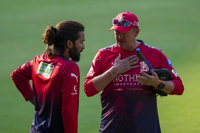 Bengaluru: Royal Challengers Bengaluru�s captain Rajat Patidar, left, and coach Andy Flower during a practice session on the eve of the Indian Premier League (IPL) 2026 cricket match against Sunrisers Hyderabad, at M Chinnaswamy Stadium in Bengaluru, Karnataka, Friday, March 27, 2026. (PTI Photo/Shailendra Bhojak) (PTI03_27_2026_000420B)