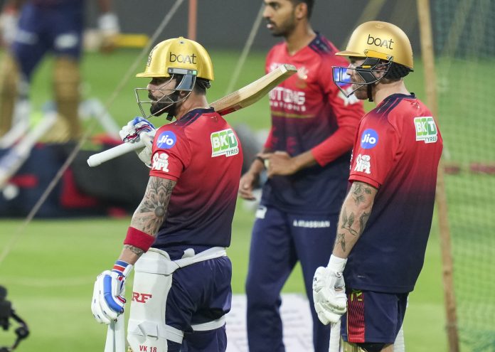 Bengaluru: Royal Challengers Bengaluru�s Virat Kohli, left, and Phil Salt, right, during a practice session ahead of the Indian Premier League (IPL) 2026 cricket match against Sunrisers Hyderabad, at M. Chinnaswamy Stadium in Bengaluru, Thursday, March 26, 2026. (PTI Photo/Shailendra Bhojak) (PTI03_26_2026_000353B)