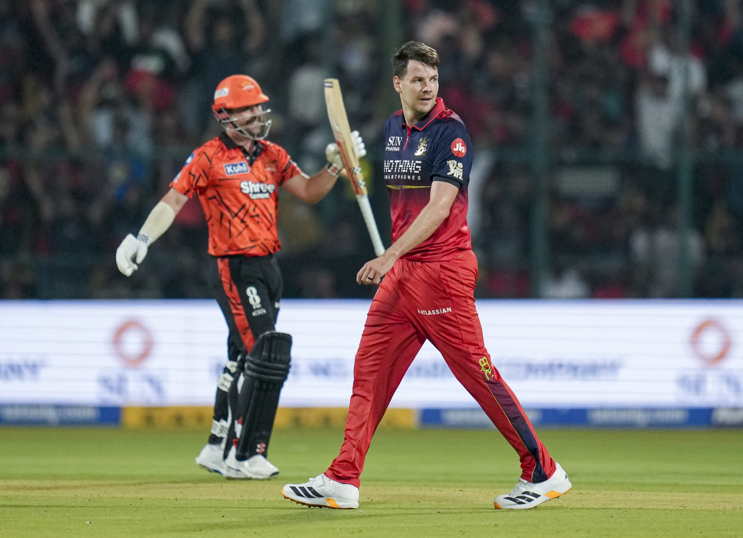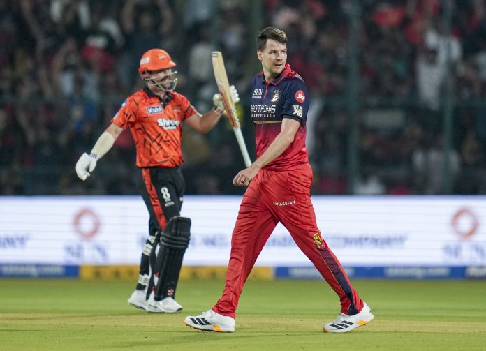 Bengaluru: Royal Challengers Bengaluru’s Jacob Duffy, front, after taking the wicket of Sunrisers Hyderabad’s Travis Head during an Indian Premier League (IPL) 2026 T20 cricket match between Royal Challengers Bengaluru and Sunrisers Hyderabad, at the M Chinnaswamy Stadium, in Bengaluru, Karnataka, Saturday, March 28, 2026. (PTI Photo/Shailendra Bhojak) (PTI03_28_2026_000248B)