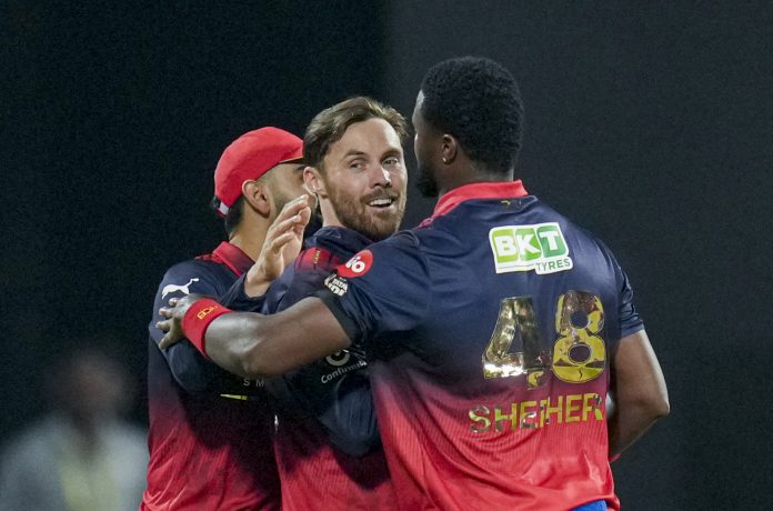 Bengaluru: Royal Challengers Bengaluru's Phil Salt, centre, celebrates with Virat Kohli, left, and Romario Shepherd after taking the catch of Sunrisers Hyderabad's Heinrich Klaasen during an Indian Premier League (IPL) 2026 T20 cricket match between Royal Challengers Bengaluru and Sunrisers Hyderabad, at the M Chinnaswamy Stadium, in Bengaluru, Karnataka, Saturday, March 28, 2026. (PTI Photo/Shailendra Bhojak) (PTI03_28_2026_000290B)