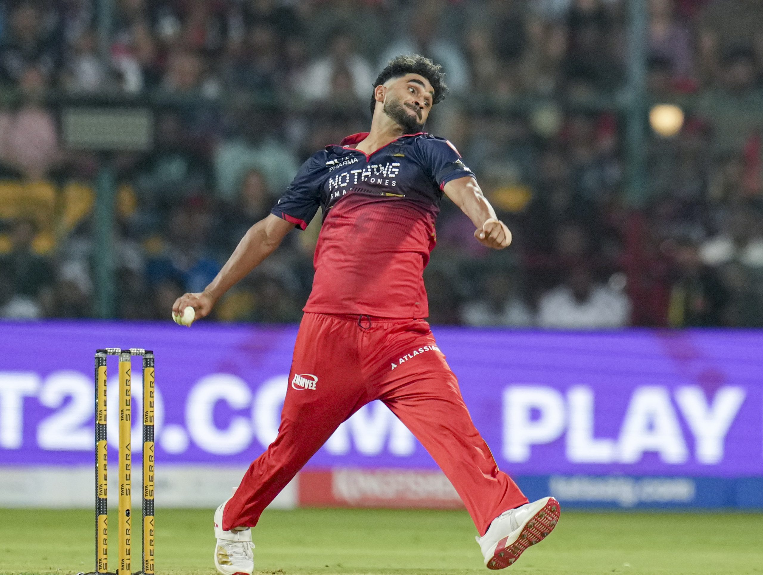 Bengaluru: Royal Challengers Bengaluru’s Abhinandan Singh bowls a delivery during an Indian Premier League (IPL) 2026 T20 cricket match between Royal Challengers Bengaluru and Sunrisers Hyderabad, at the M Chinnaswamy Stadium, in Bengaluru, Karnataka, Saturday, March 28, 2026. (PTI Photo/Shailendra Bhojak) (PTI03_28_2026_000314B)