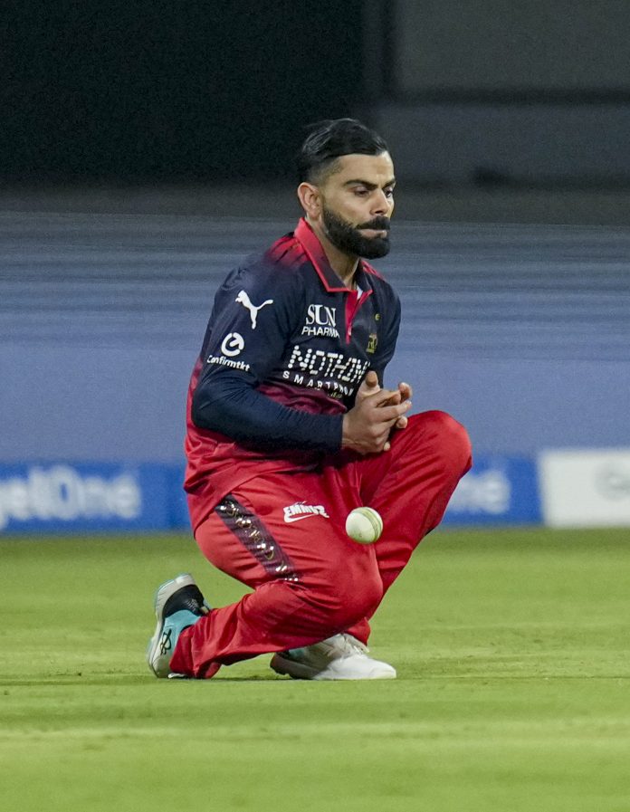 Bengaluru: Royal Challengers Bengaluru’s Virat Kohli drops a catch of Sunrisers Hyderabad’s Aniket Verma during an Indian Premier League (IPL) 2026 T20 cricket match between Royal Challengers Bengaluru and Sunrisers Hyderabad, at the M Chinnaswamy Stadium, in Bengaluru, Karnataka, Saturday, March 28, 2026. (PTI Photo/Shailendra Bhojak) (PTI03_28_2026_000322B)