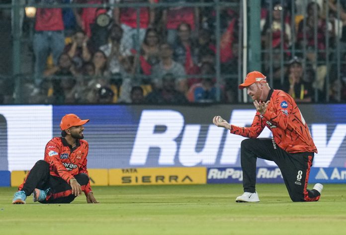 Bengaluru: Sunrisers Hyderabad’s Heinrich Klaasen, right, interacts with Aniket Verma after a brief collision while taking the catch of Royal Challengers Bengaluru’s Phil Salt during an Indian Premier League (IPL) 2026 T20 cricket match between Royal Challengers Bengaluru and Sunrisers Hyderabad, at the M Chinnaswamy Stadium, in Bengaluru, Karnataka, Saturday, March 28, 2026. (PTI Photo/Shailendra Bhojak) (PTI03_28_2026_000357B)