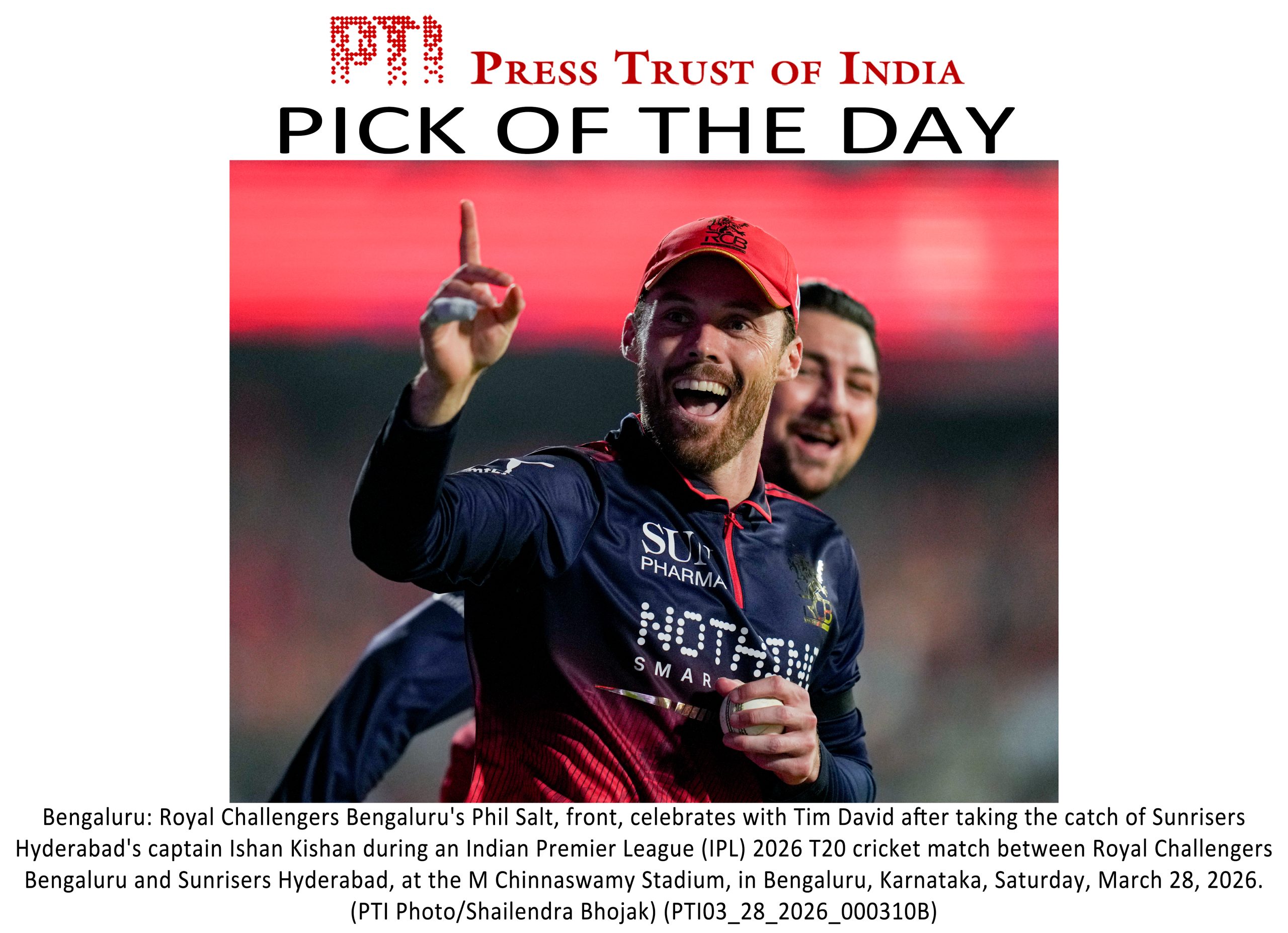PLS TAKE NOTE OF THIS PTI PICK OF THE DAY::: Bengaluru: Royal Challengers Bengaluru’s Phil Salt, front, celebrates with Tim David after taking the catch of Sunrisers Hyderabad’s captain Ishan Kishan during an Indian Premier League (IPL) 2026 T20 cricket match between Royal Challengers Bengaluru and Sunrisers Hyderabad, at the M Chinnaswamy Stadium, in Bengaluru, Karnataka, Saturday, March 28, 2026. (PTI Photo/Shailendra Bhojak) (PTI03_28_2026_000310B)(PTI03_28_2026_000349B)