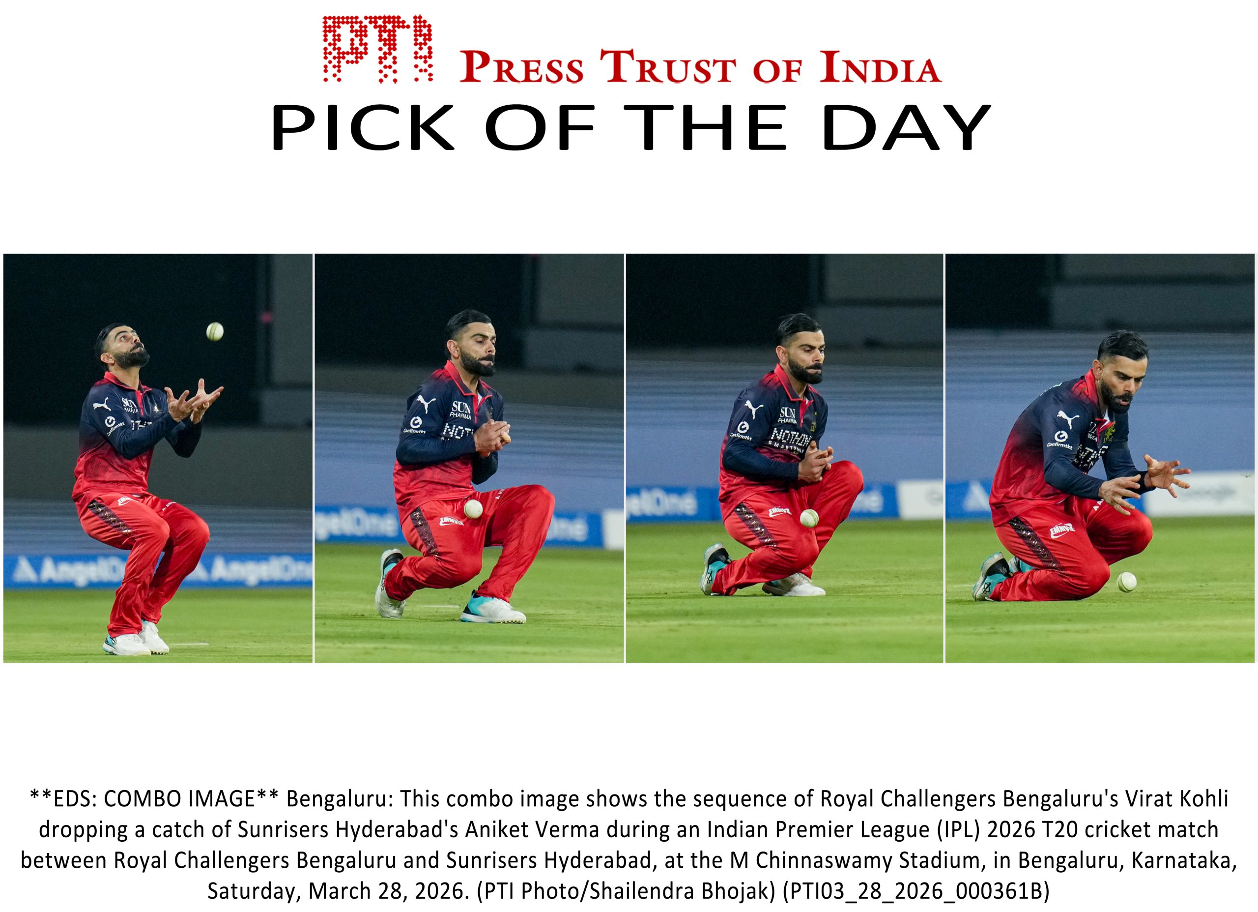 PLS TAKE NOTE OF THIS PTI PICK OF THE DAY::: **EDS: COMBO IMAGE** Bengaluru: This combo image shows the sequence of Royal Challengers Bengaluru’s Virat Kohli dropping a catch of Sunrisers Hyderabad’s Aniket Verma during an Indian Premier League (IPL) 2026 T20 cricket match between Royal Challengers Bengaluru and Sunrisers Hyderabad, at the M Chinnaswamy Stadium, in Bengaluru, Karnataka, Saturday, March 28, 2026. (PTI Photo/Shailendra Bhojak) (PTI03_28_2026_000361B)(PTI03_28_2026_000372B)