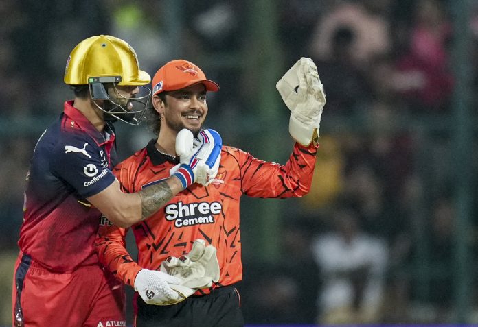 Bengaluru: Royal Challengers Bengaluru’s Virat Kohli, left, with Sunrisers Hyderabad’s captain Ishan Kishan during an Indian Premier League (IPL) 2026 T20 cricket match between Royal Challengers Bengaluru and Sunrisers Hyderabad, at the M Chinnaswamy Stadium, in Bengaluru, Karnataka, Saturday, March 28, 2026. (PTI Photo/Shailendra Bhojak) (PTI03_28_2026_000367B)