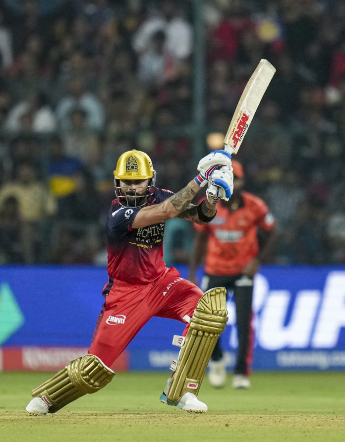 Bengaluru: Royal Challengers Bengaluru’s Virat Kohli plays a shot during an Indian Premier League (IPL) 2026 T20 cricket match between Royal Challengers Bengaluru and Sunrisers Hyderabad, at the M Chinnaswamy Stadium, in Bengaluru, Karnataka, Saturday, March 28, 2026. (PTI Photo/Shailendra Bhojak) (PTI03_28_2026_000385B)