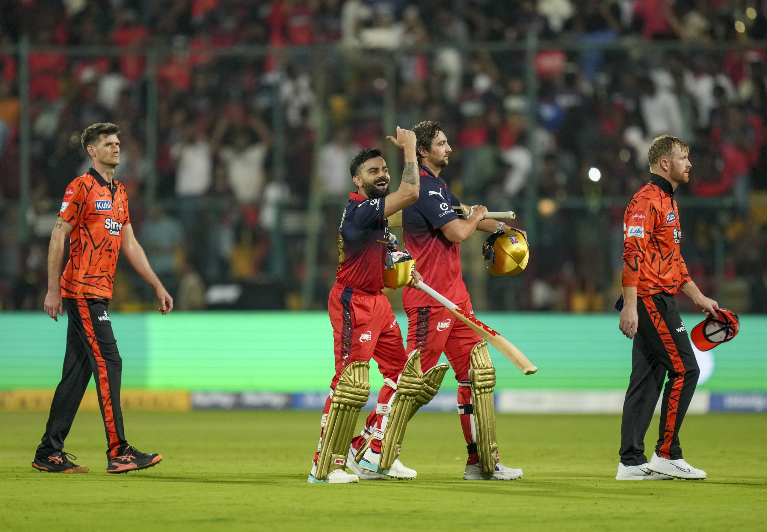 Bengaluru: Royal Challengers Bengaluru’s Virat Kohli and Tim David celebrate after winning an Indian Premier League (IPL) 2026 T20 cricket match between Royal Challengers Bengaluru and Sunrisers Hyderabad, at the M Chinnaswamy Stadium, in Bengaluru, Karnataka, Saturday, March 28, 2026. (PTI Photo/Shailendra Bhojak) (PTI03_28_2026_000421B)