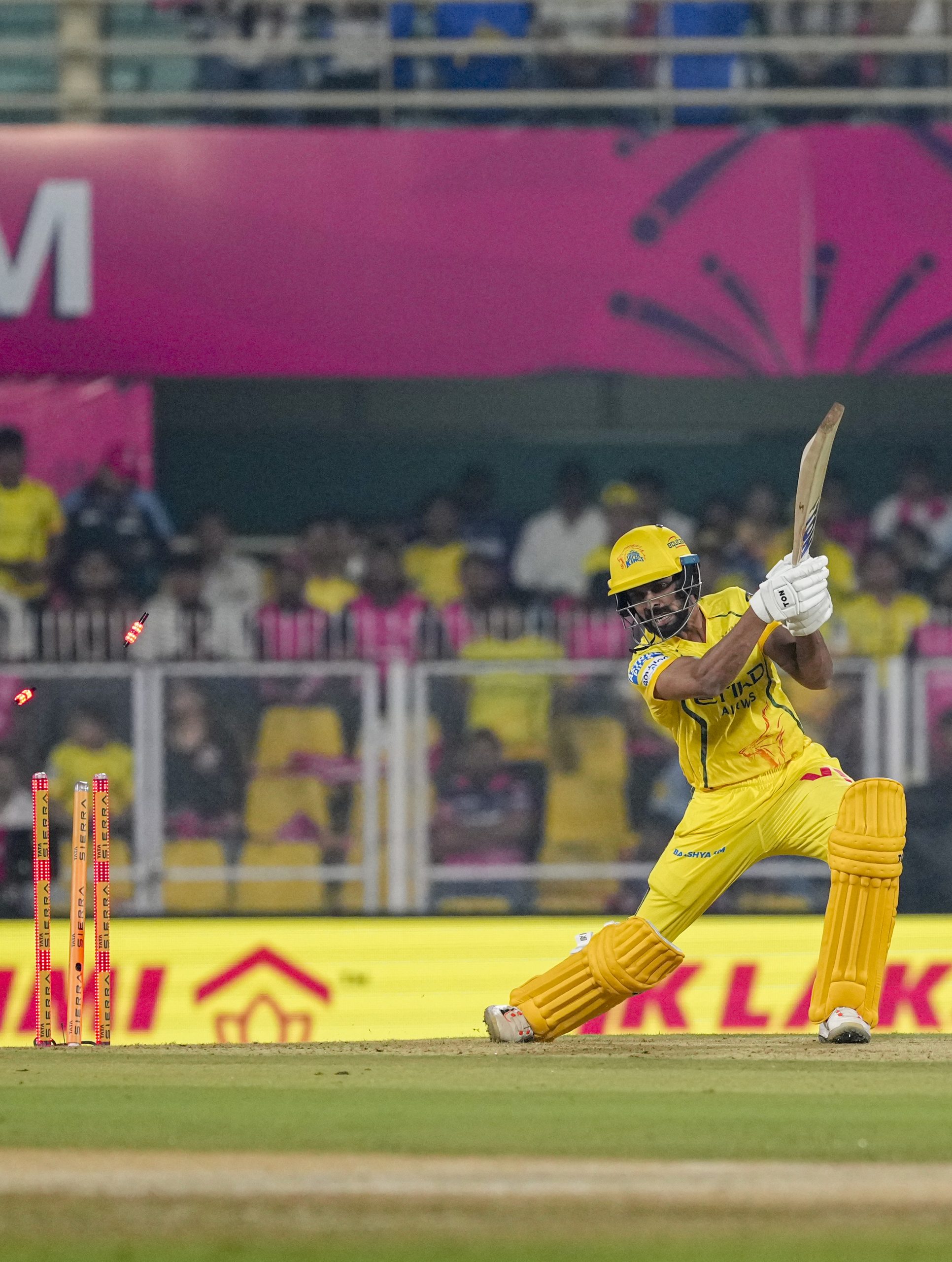 Guwahati: Chennai Super Kings’ captain Ruturaj Gaikwad being bowled by Rajasthan Royals’ Jofra Archer during an Indian Premier League (IPL) 2026 T20 cricket match between Rajasthan Royals and Chennai Super Kings, at ACA Stadium, Barsapara, in Guwahati, Assam, Monday, March 30, 2026. (PTI Photo/Swapan Mahapatra) (PTI03_30_2026_000356B) *** Local Caption ***