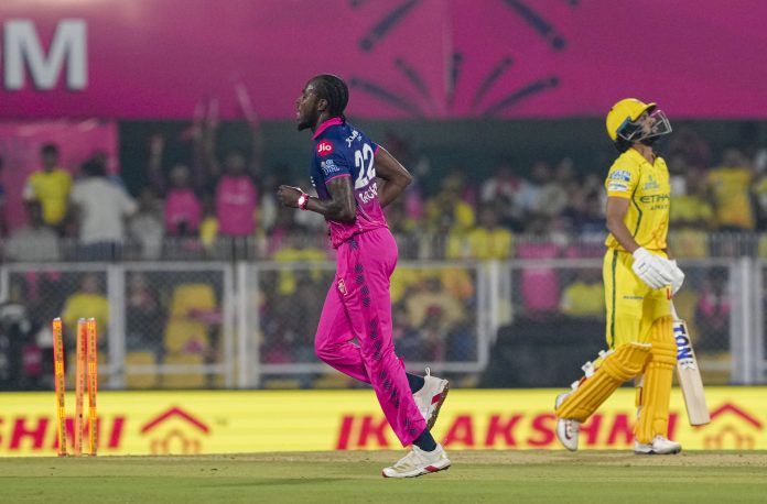 Guwahati: Rajasthan Royals’ Jofra Archer celebrates the wicket of Chennai Super Kings’ captain Ruturaj Gaikwad during an Indian Premier League (IPL) 2026 T20 cricket match between Rajasthan Royals and Chennai Super Kings, at ACA Stadium, Barsapara, in Guwahati, Assam, Monday, March 30, 2026. (PTI Photo/Swapan Mahapatra) (PTI03_30_2026_000354B) *** Local Caption ***