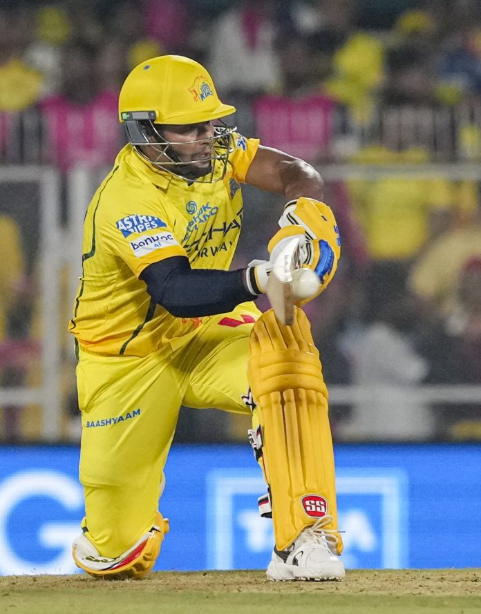 Guwahati: Chennai Super Kings’ Sarfaraz Khan plays a shot during an Indian Premier League (IPL) 2026 T20 cricket match between Rajasthan Royals and Chennai Super Kings, at ACA Stadium, Barsapara, in Guwahati, Assam, Monday, March 30, 2026. (PTI Photo/Swapan Mahapatra) (PTI03_30_2026_000373B) *** Local Caption ***
