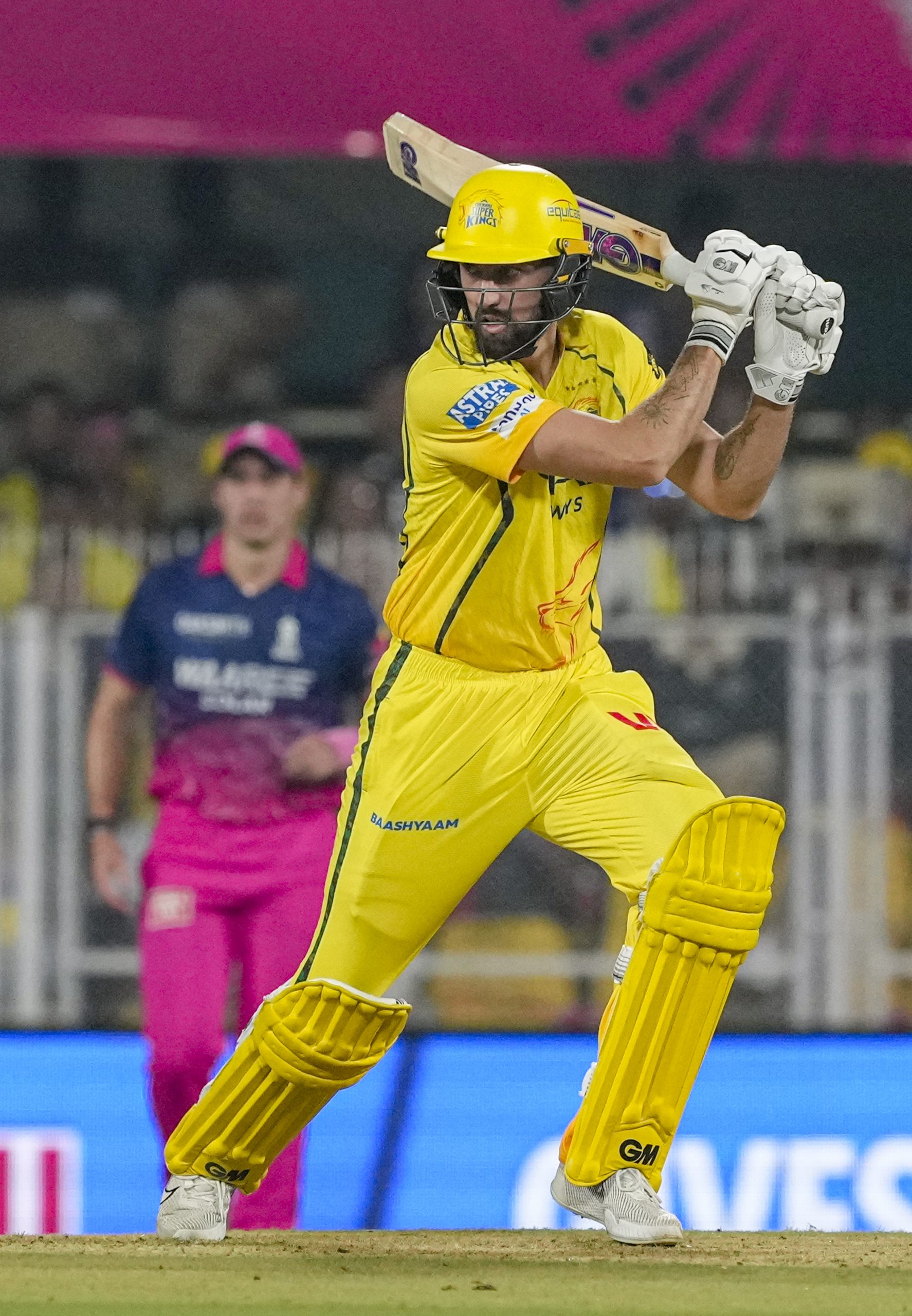 Guwahati: Chennai Super Kings’ Matthew Short plays a shot during an Indian Premier League (IPL) 2026 T20 cricket match between Rajasthan Royals and Chennai Super Kings, at ACA Stadium, Barsapara, in Guwahati, Assam, Monday, March 30, 2026. (PTI Photo/Swapan Mahapatra) (PTI03_30_2026_000370B) *** Local Caption ***