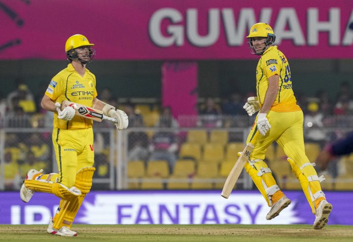 Guwahati: Chennai Super Kings’ Jamie Overton, right, and Matt Henry run between the wickets during an Indian Premier League (IPL) 2026 T20 cricket match between Rajasthan Royals and Chennai Super Kings, at ACA Stadium, Barsapara, in Guwahati, Assam, Monday, March 30, 2026. (PTI Photo/Swapan Mahapatra) (PTI03_30_2026_000437B) *** Local Caption ***