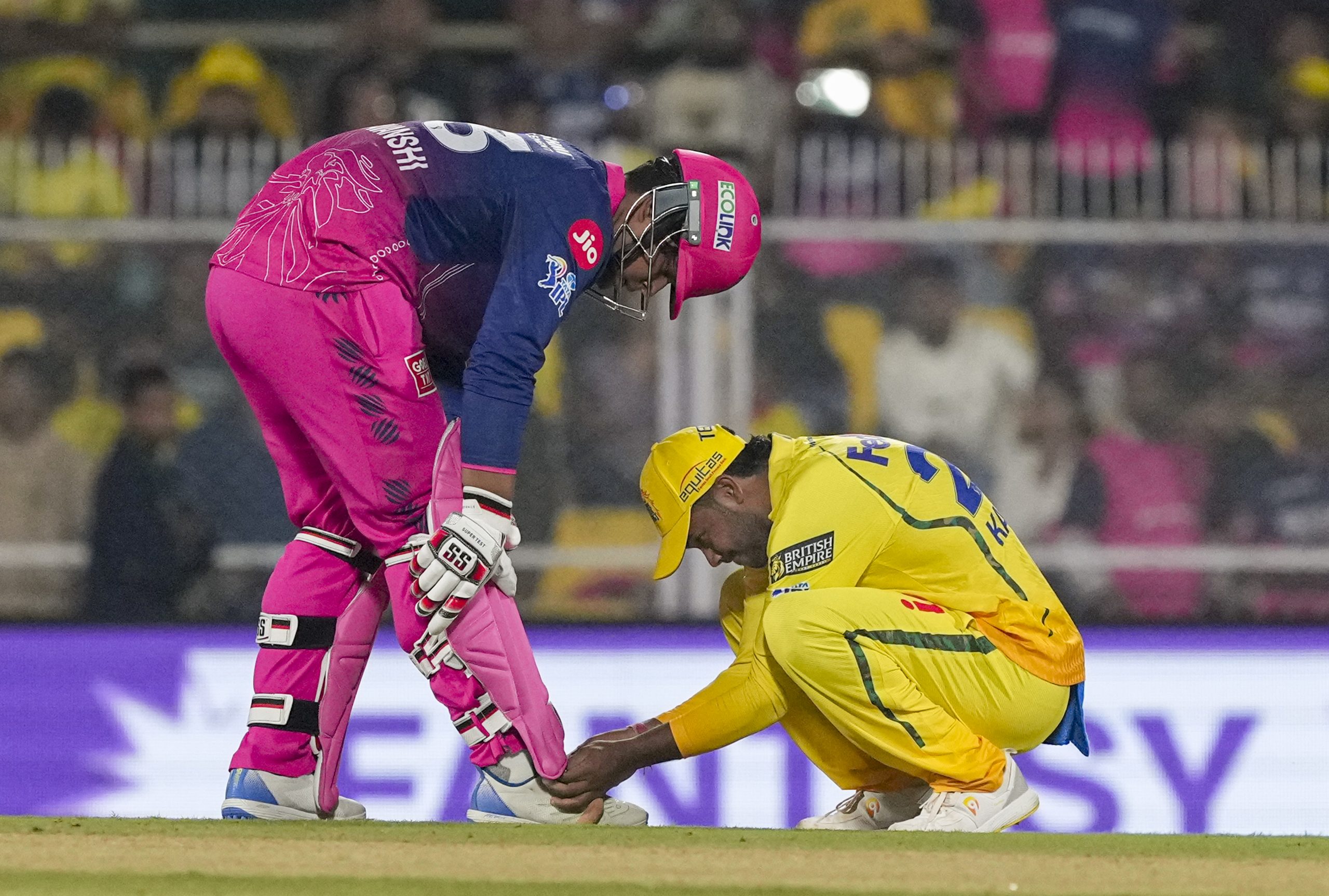 Guwahati: Chennai Super Kings’ Kartik Sharma ties shoe laces of Rajasthan Royals’ Vaibhav Sooryavanshi during an Indian Premier League (IPL) 2026 T20 cricket match between Rajasthan Royals and Chennai Super Kings, at ACA Stadium, Barsapara, in Guwahati, Assam, Monday, March 30, 2026. (PTI Photo/Swapan Mahapatra) (PTI03_30_2026_000452B) *** Local Caption ***
