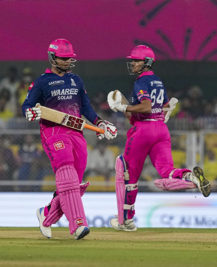 Guwahati: Rajasthan Royals’ Vaibhav Sooryavanshi, left, and Yashasvi Jaiswal run between the wickets during an Indian Premier League (IPL) 2026 T20 cricket match between Rajasthan Royals and Chennai Super Kings, at ACA Stadium, Barsapara, in Guwahati, Assam, Monday, March 30, 2026. (PTI Photo/Swapan Mahapatra) (PTI03_30_2026_000459B) *** Local Caption ***