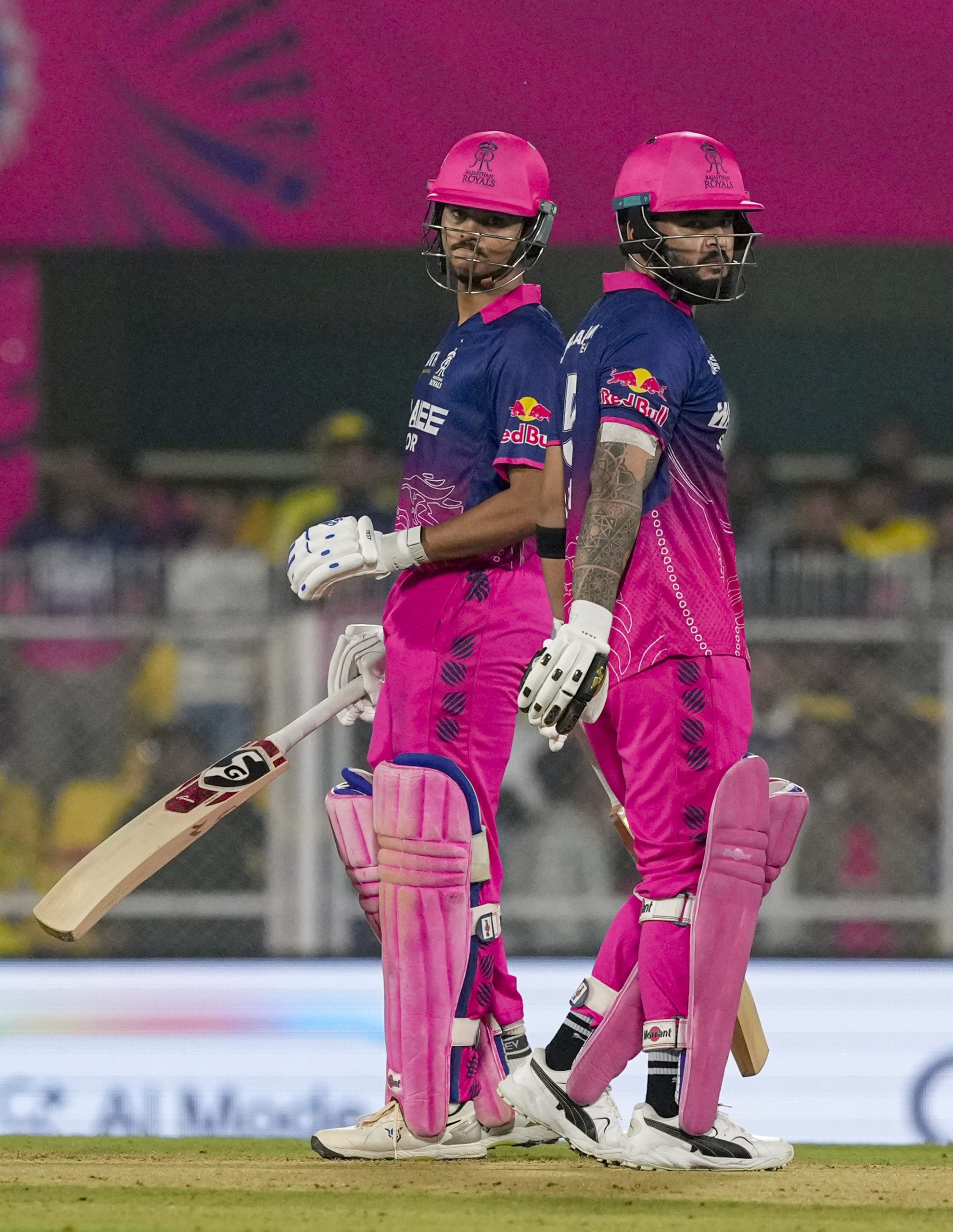 Guwahati: Rajasthan Royals’ captain Riyan Parag, right, and Yashasvi Jaiswal during an Indian Premier League (IPL) 2026 T20 cricket match between Rajasthan Royals and Chennai Super Kings, at ACA Stadium, Barsapara, in Guwahati, Assam, Monday, March 30, 2026. (PTI Photo/Swapan Mahapatra) (PTI03_30_2026_000504B) *** Local Caption ***