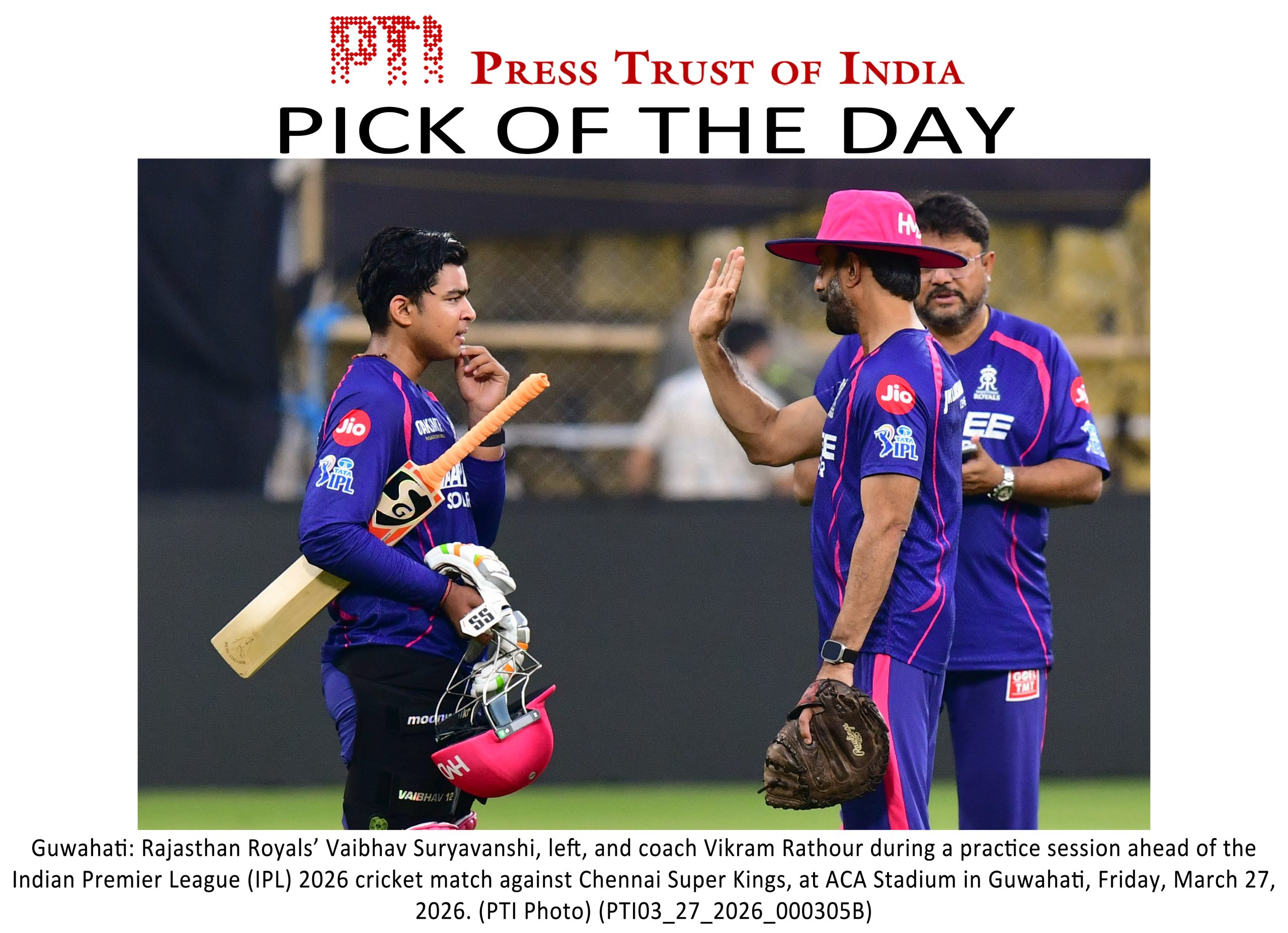 PLS TAKE NOTE OF THIS PTI PICK OF THE DAY::: Guwahati: Rajasthan Royals� Vaibhav Suryavanshi, left, and coach Vikram Rathour during a practice session ahead of the Indian Premier League (IPL) 2026 cricket match against Chennai Super Kings, at ACA Stadium in Guwahati, Friday, March 27, 2026. (PTI Photo) (PTI03_27_2026_000305B)(PTI03_27_2026_000345B)