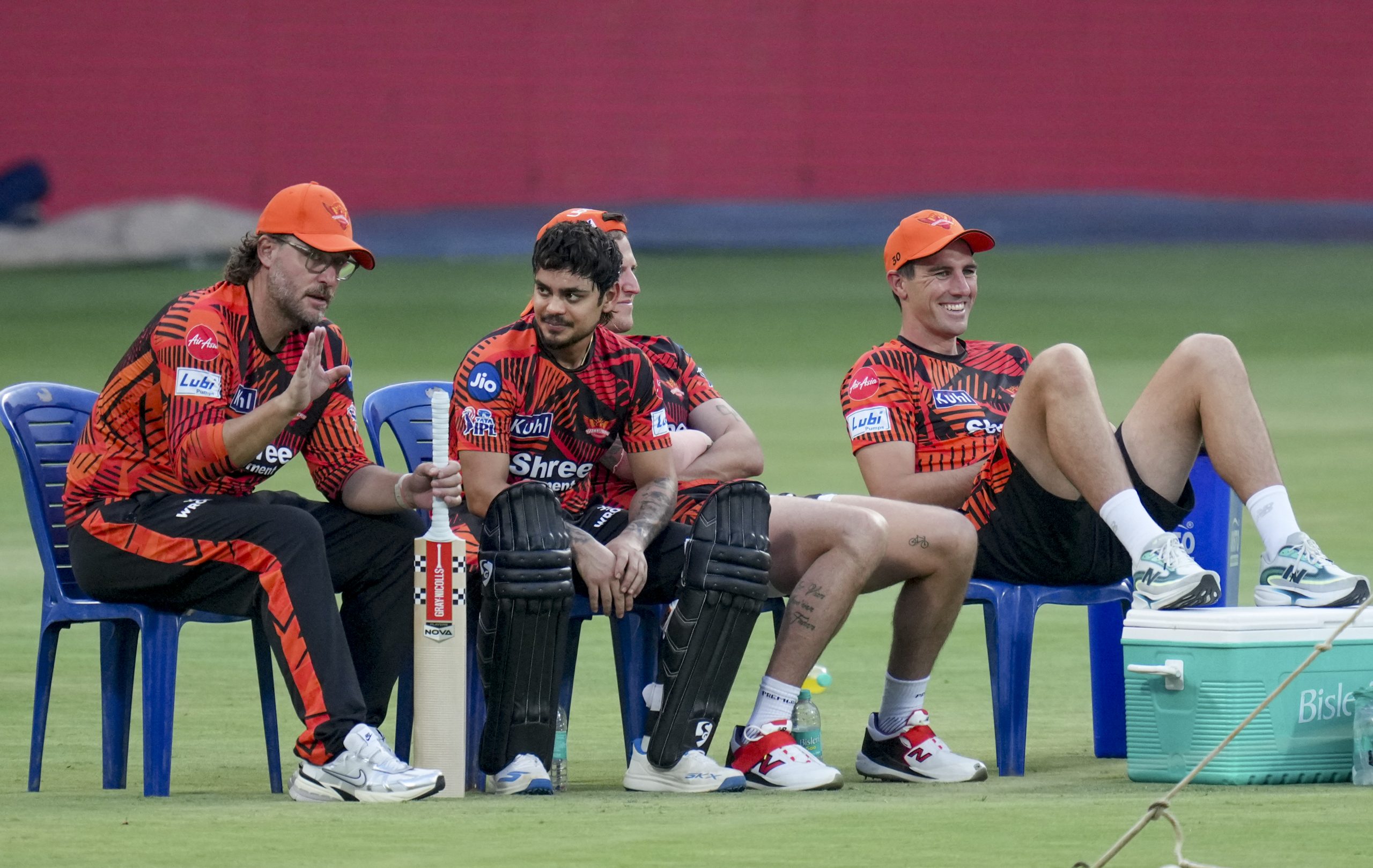 Bengaluru: Sunrisers Hyderabad�s coach Daniel Vettori, left, captain Ishan Kishan, second left, and others during a practice session on the eve of the Indian Premier League (IPL) 2026 cricket match against Royal Challengers Bengaluru, at M Chinnaswamy Stadium in Bengaluru, Karnataka, Friday, March 27, 2026. (PTI Photo/Shailendra Bhojak) (PTI03_27_2026_000436B) *** Local Caption ***