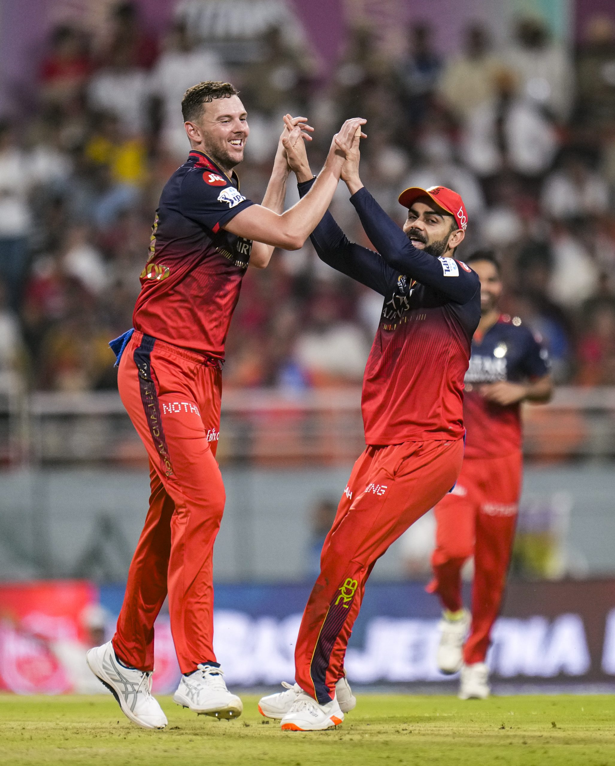 New Chandigarh: Royal Challengers Bengaluru's Virat Kohli and Josh Hazlewood celebrate the wicket of Punjab Kings' Azmatullah Omarzai during the Indian Premier League (IPL) 2025 Qualifier 1 cricket match between Punjab Kings and Royal Challengers Bengaluru, in New Chandigarh, Thursday, May 29, 2025. (PTI Photo/Ravi Choudhary) (PTI05_29_2025_000488B)