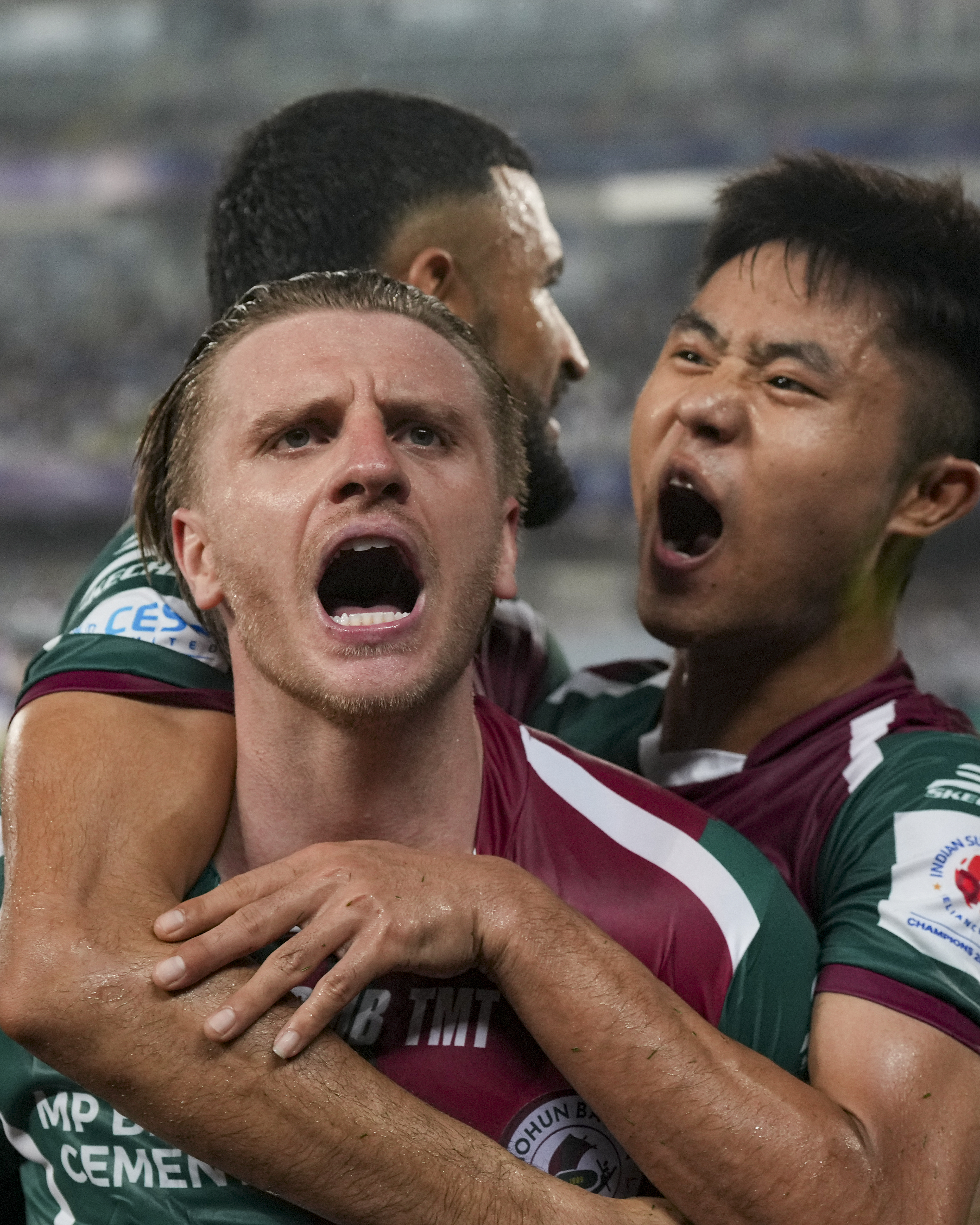 Kolkata: Mohun Bagan Super Giant�s Jason Steven Cummings celebrates after scoring a goal during an Indian Super League (ISL) 2024-25 final football match between Mohun Bagan Super Giant and Bengaluru FC, at Vivekananda Yuba Bharati Krirangan, in Kolkata, West Bengal, Saturday, April 12, 2025. (PTI Photo/Swapan Mahapatra) (PTI04_12_2025_000510B)