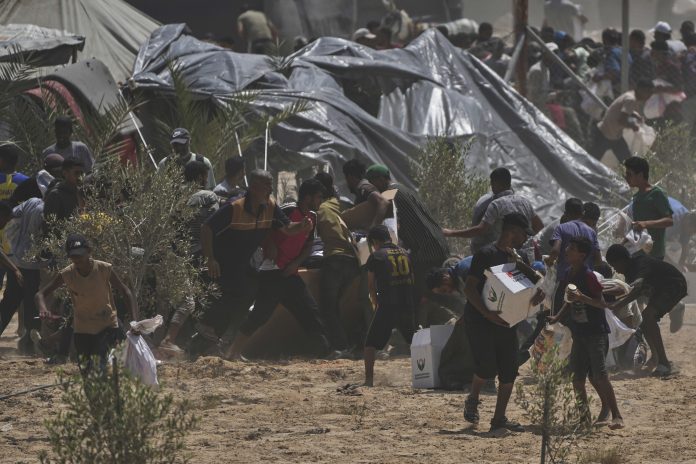 Palestinians rush to collect humanitarian aid packages from the United Arab Emirates, airdropped by parachutes into Deir al-Balah, in the central Gaza Strip, Tuesday, Aug. 19, 2025. AP/PTI(AP08_19_2025_000343B)