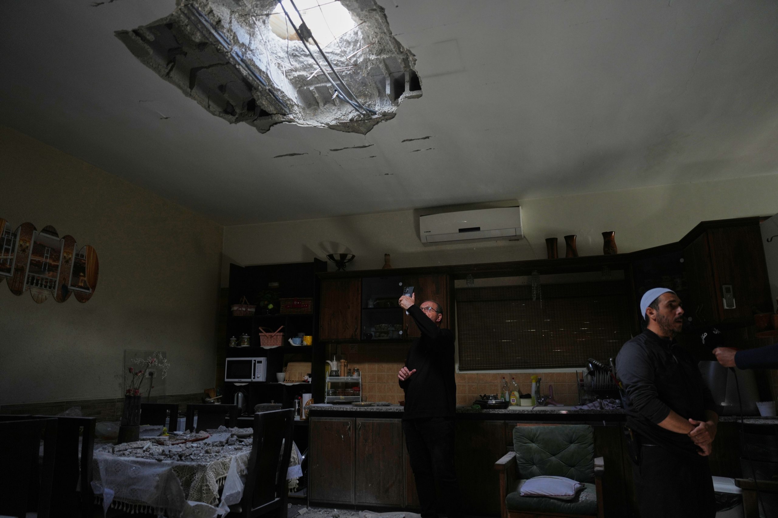 Residents inspect a damaged house following an Iranian missile strike in Shefaram Israel, Monday, March 30, 2026. AP/PTI(AP03_30_2026_000240B)