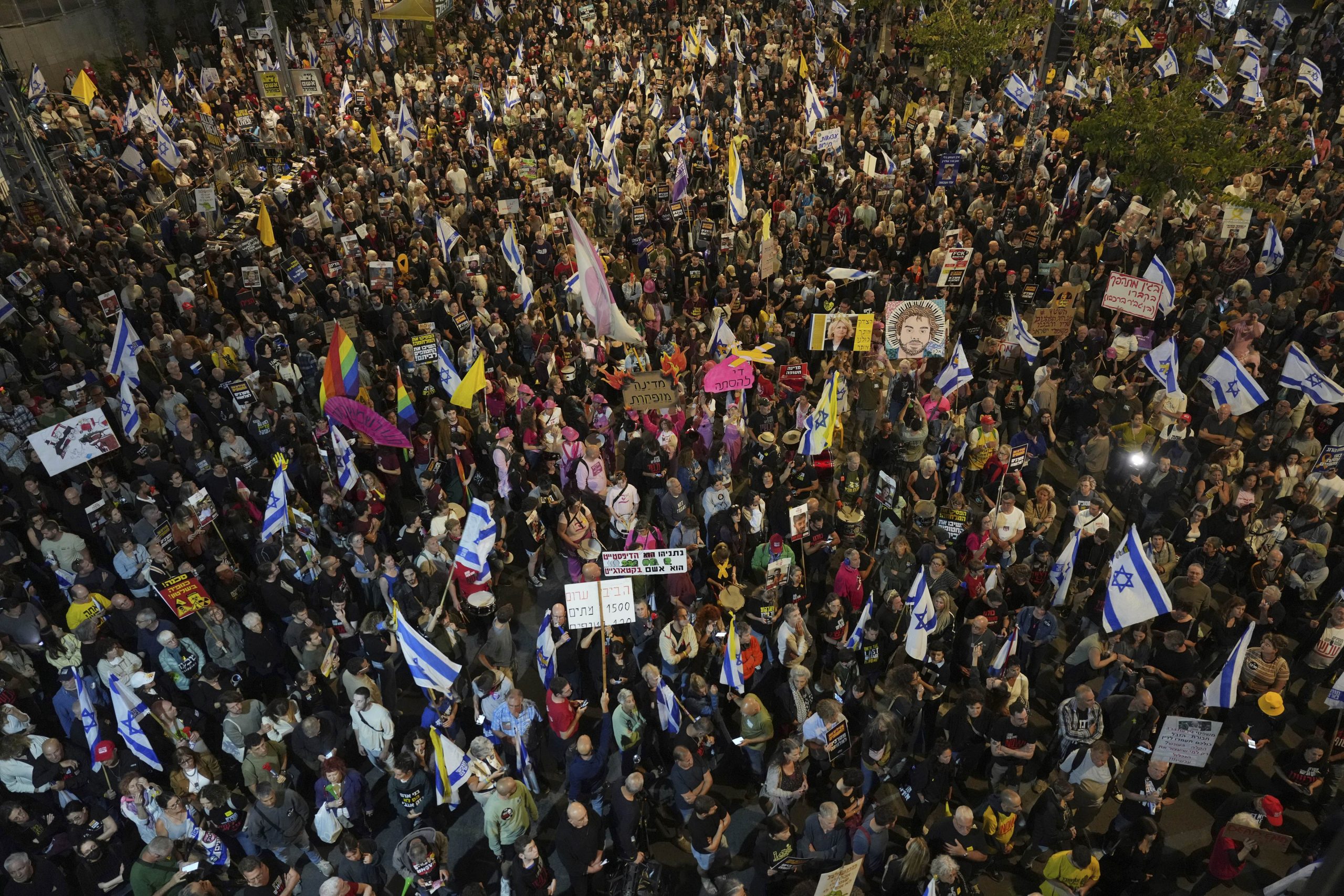 Hundreds of protesters rallied Saturday night in Tel Aviv, some holding photos of Palestinian children killed in Gaza, with others demanding a deal to end the war and bring all hostages home.