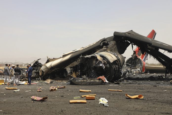 Yemenis inspect the wreckage of a destroyed civilian aircraft following Israeli airstrikes on Sanaa International Airport in Sanaa, Yemen, Wednesday, May 7, 2025. AP/PTI(AP05_07_2025_000401B)