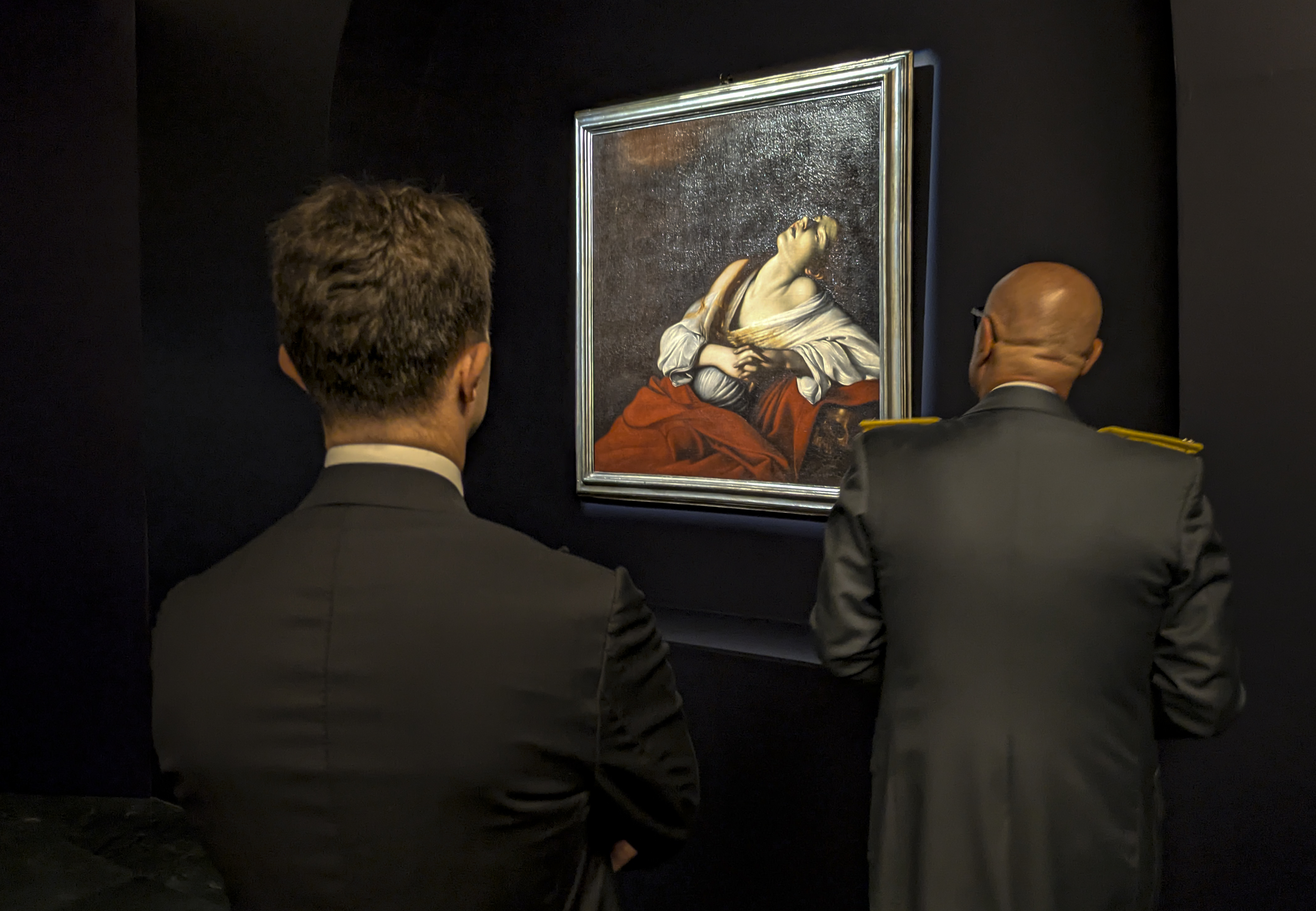 **EDS: TO GO WITH STORY** New Delhi: Seventeenth-century Italian Baroque painter Michelangelo Merisi da Caravaggio�s painting, ‘Mary Magdalene in Ecstasy’, was unveiled at the Italian Cultural Centre, in New Delhi, Friday, April 11, 2025. The painting, believed to be lost for centuries, has come to India for the first time. (PTI Photo/Manish Sain) (PTI04_11_2025_000286B) *** Local Caption ***