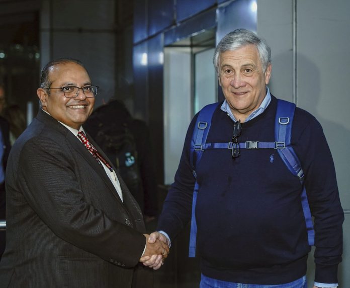 **EDS: THIRD PARTY IMAGE** In this image released by @MEAIndia via X on Friday, April 11, 2025, Italian Deputy Prime Minister and Foreign Minister Antonio Tajani being received upon his arrival in India. (@MEAIndia on X via PTI Photo)(PTI04_11_2025_000124B)